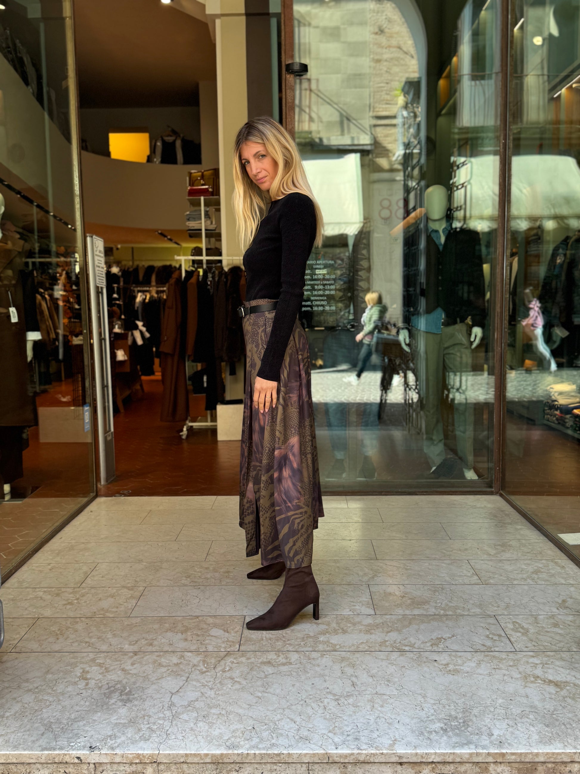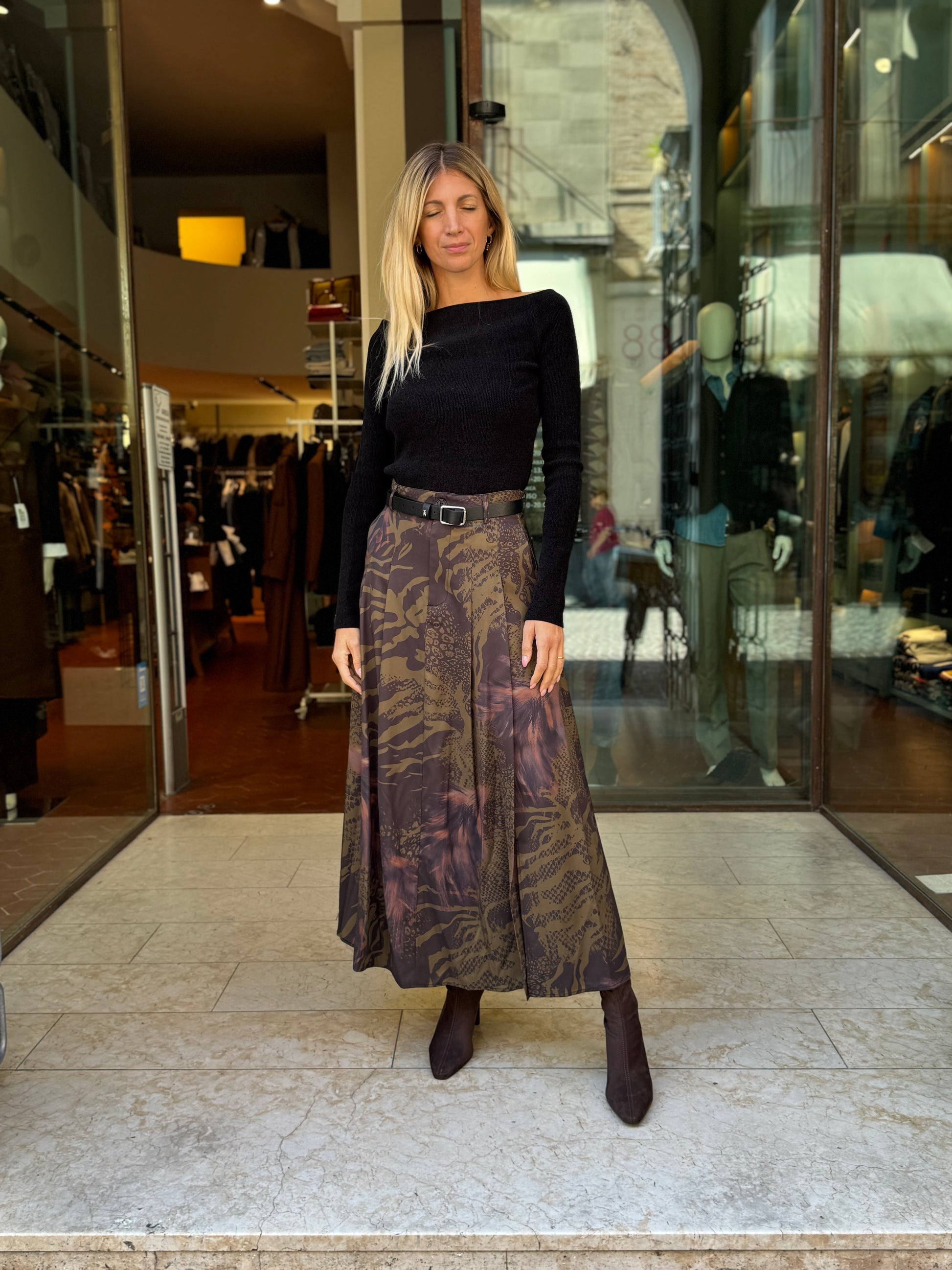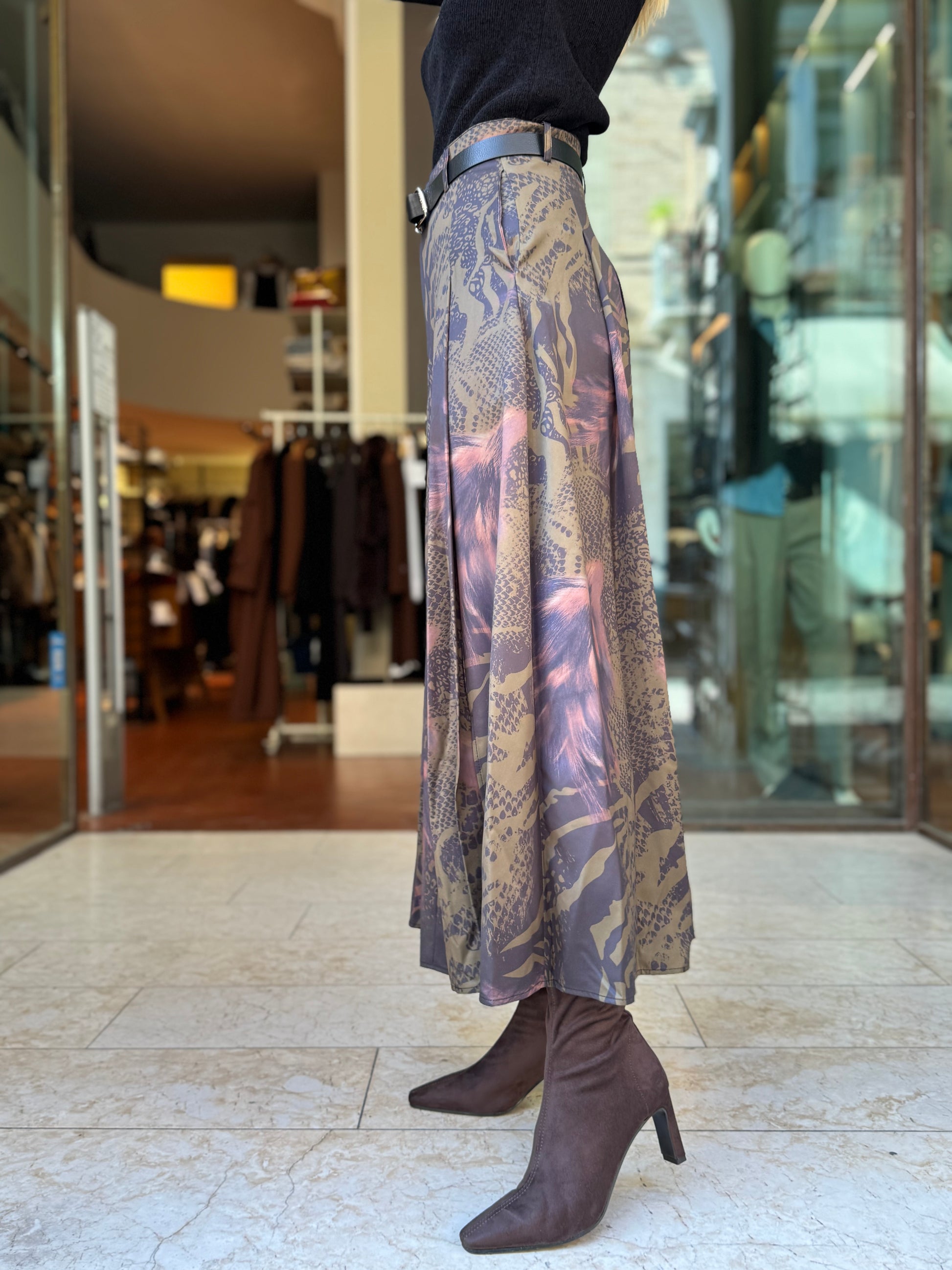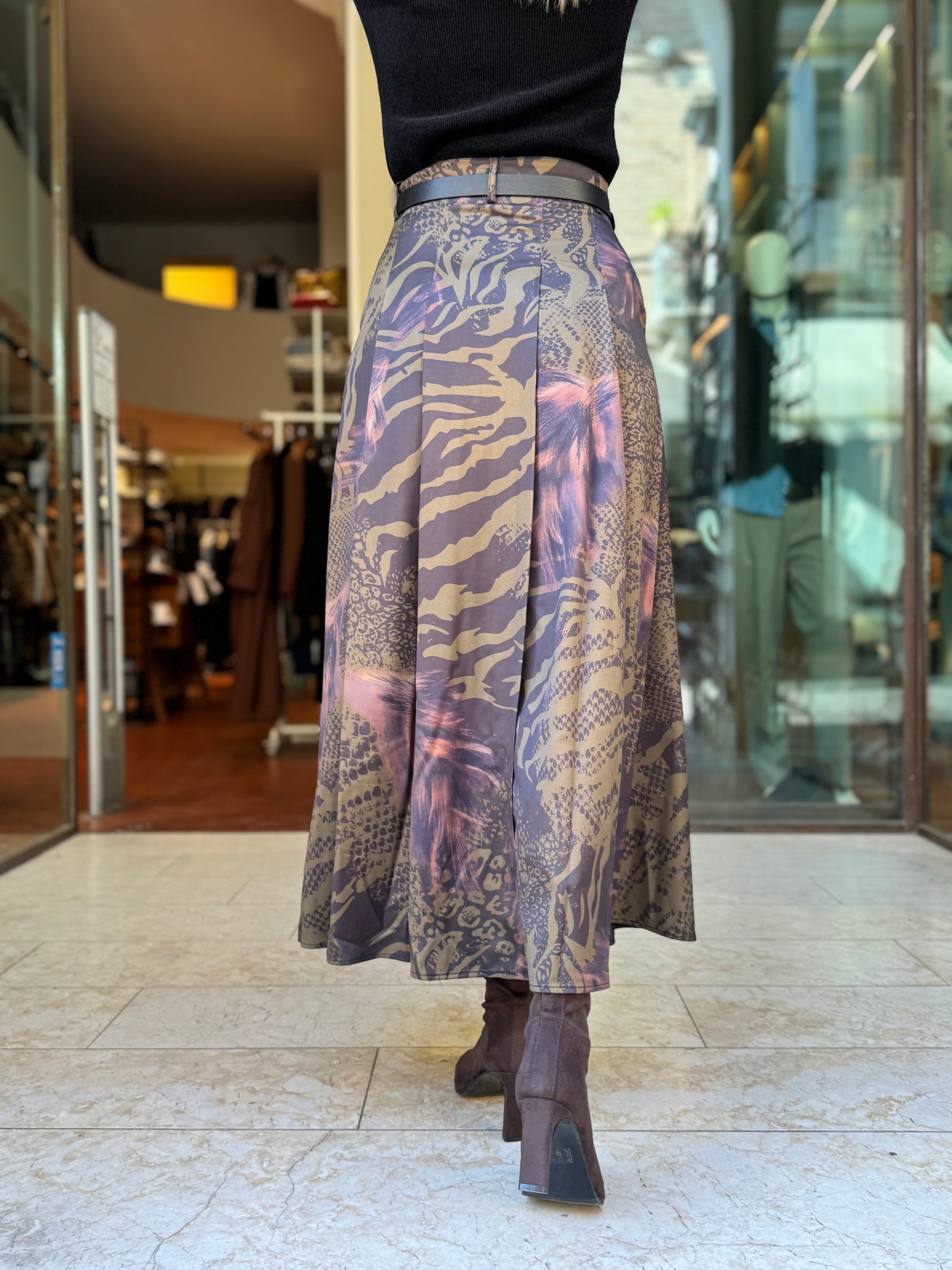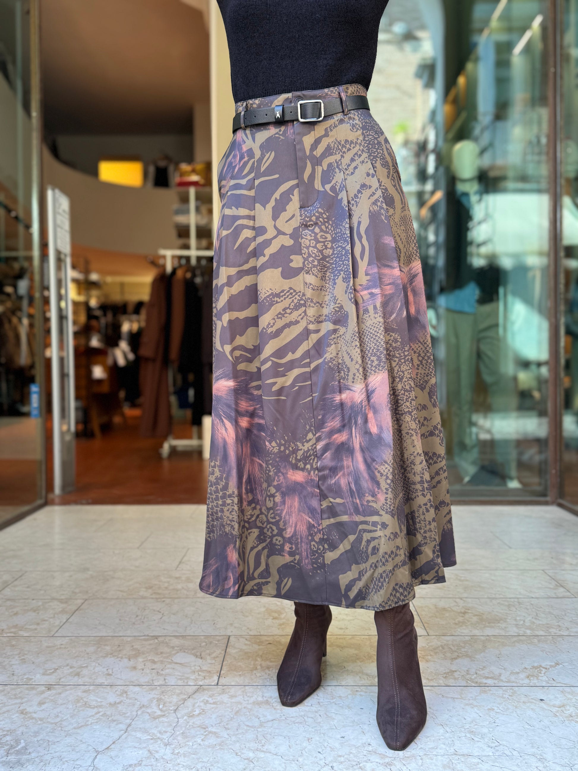 - Anonyme Gonna lunga animalier sui toni del rugginee/militare/nero con allacciatura ad un bottone più zip, provvista di passanti e spacco centrale dietro