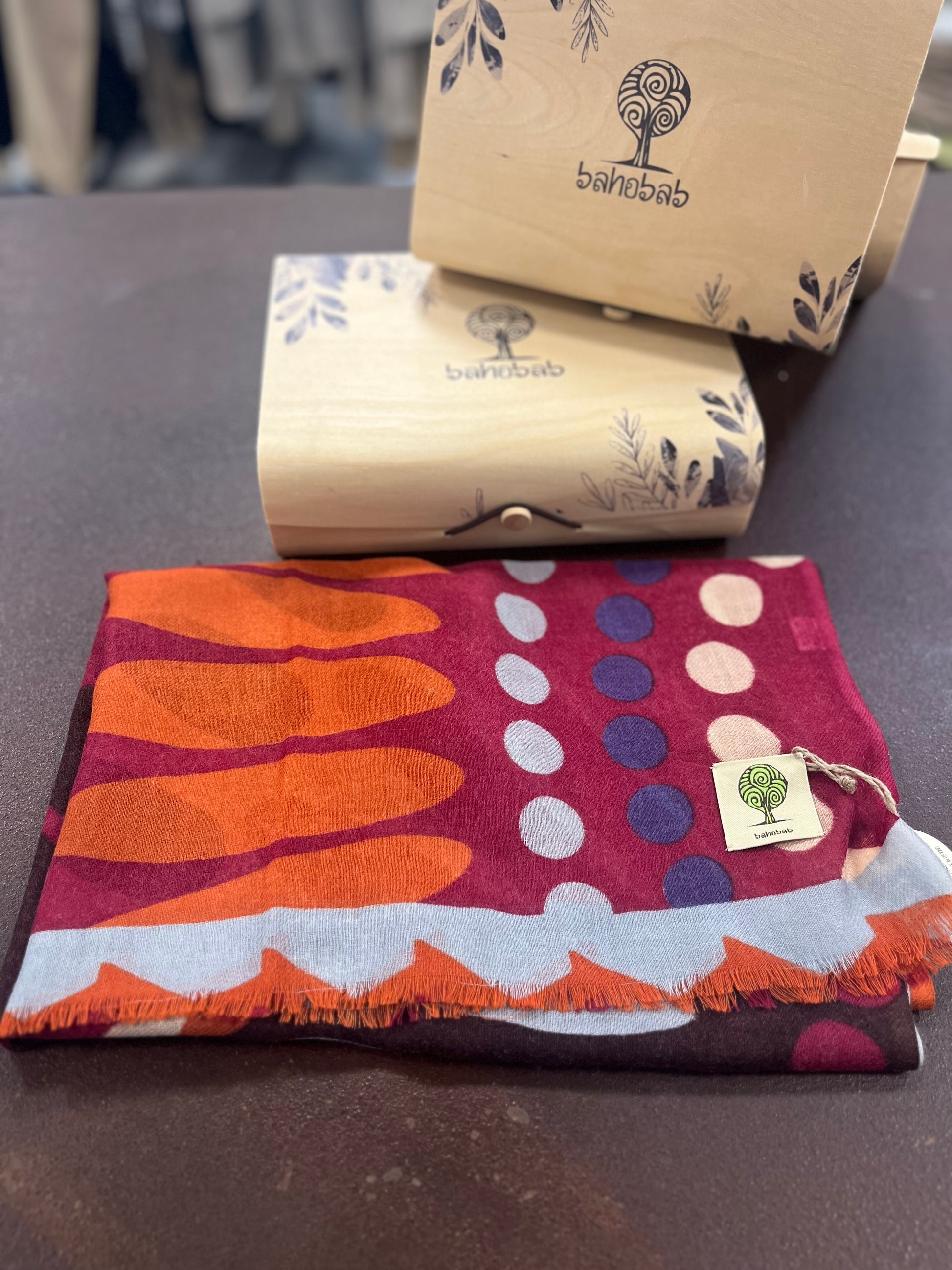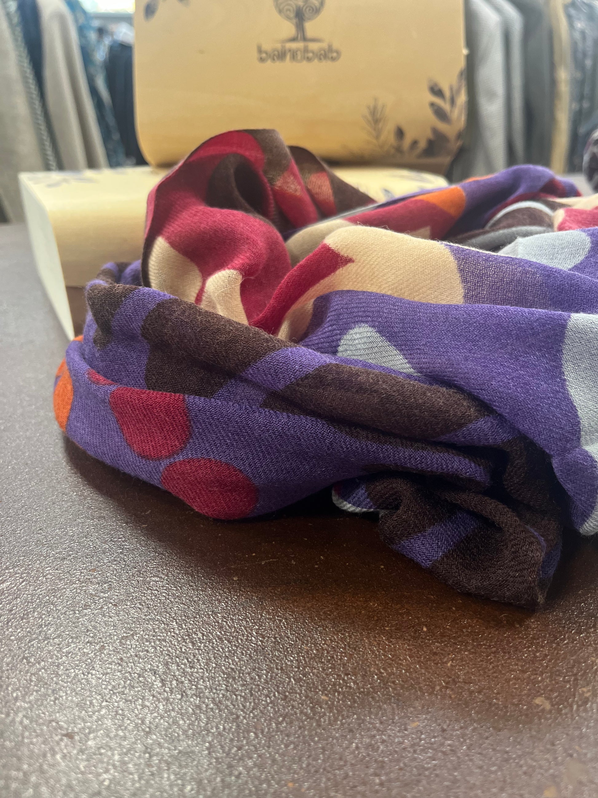 - Bahobab Sciarpa 100% lana a fantasia cerchi marrone, arancio, bordeaux, celeste, panna e viola