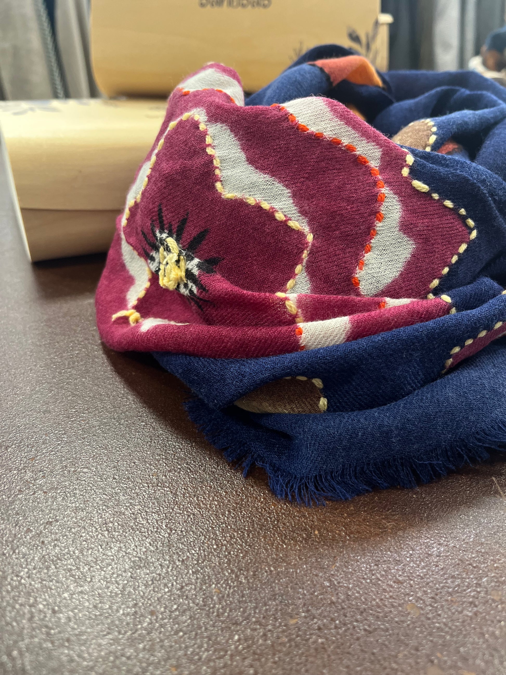 Bahobab Sciarpa ricamata 100% lana a fiori su BASE BLU