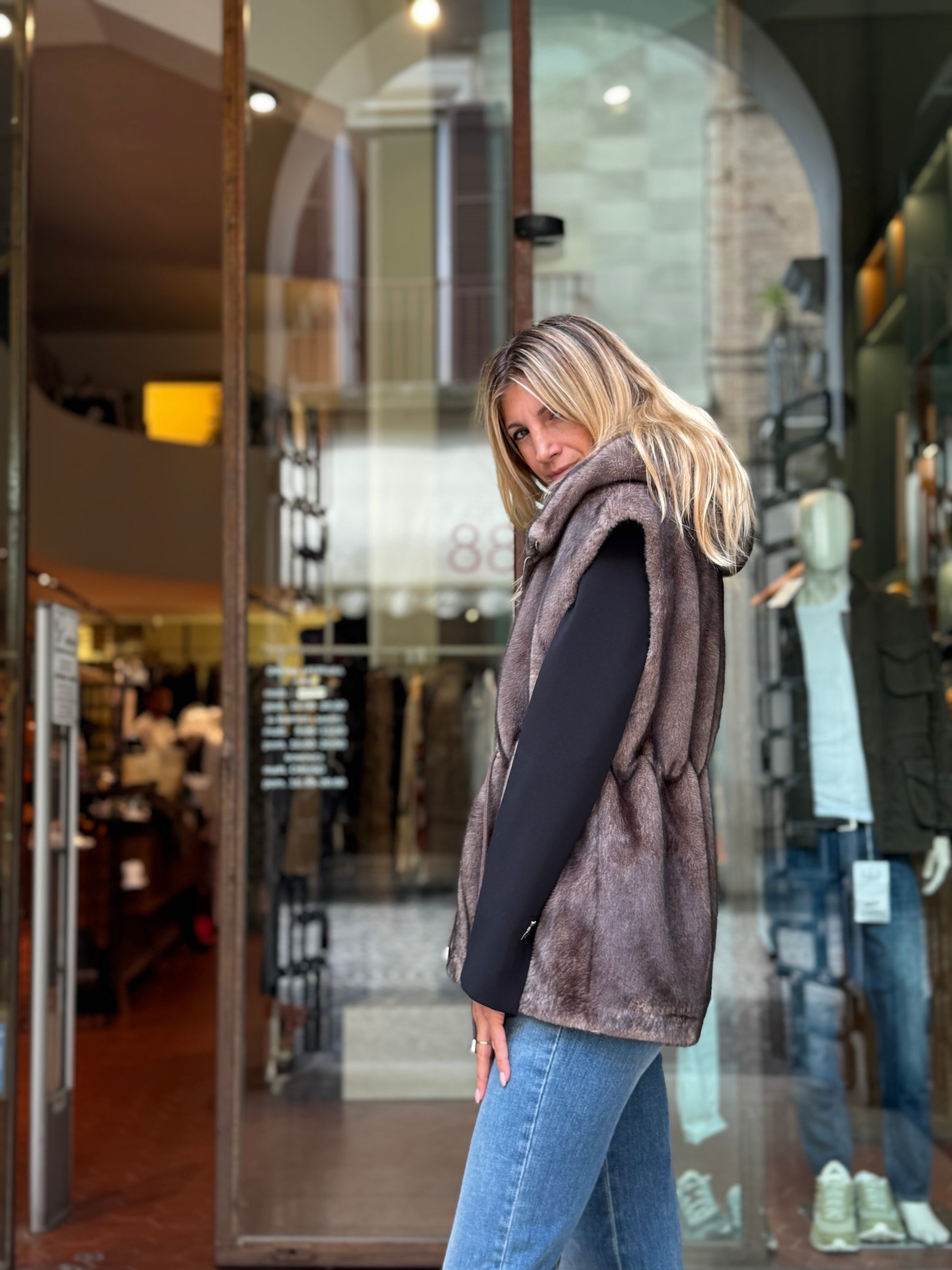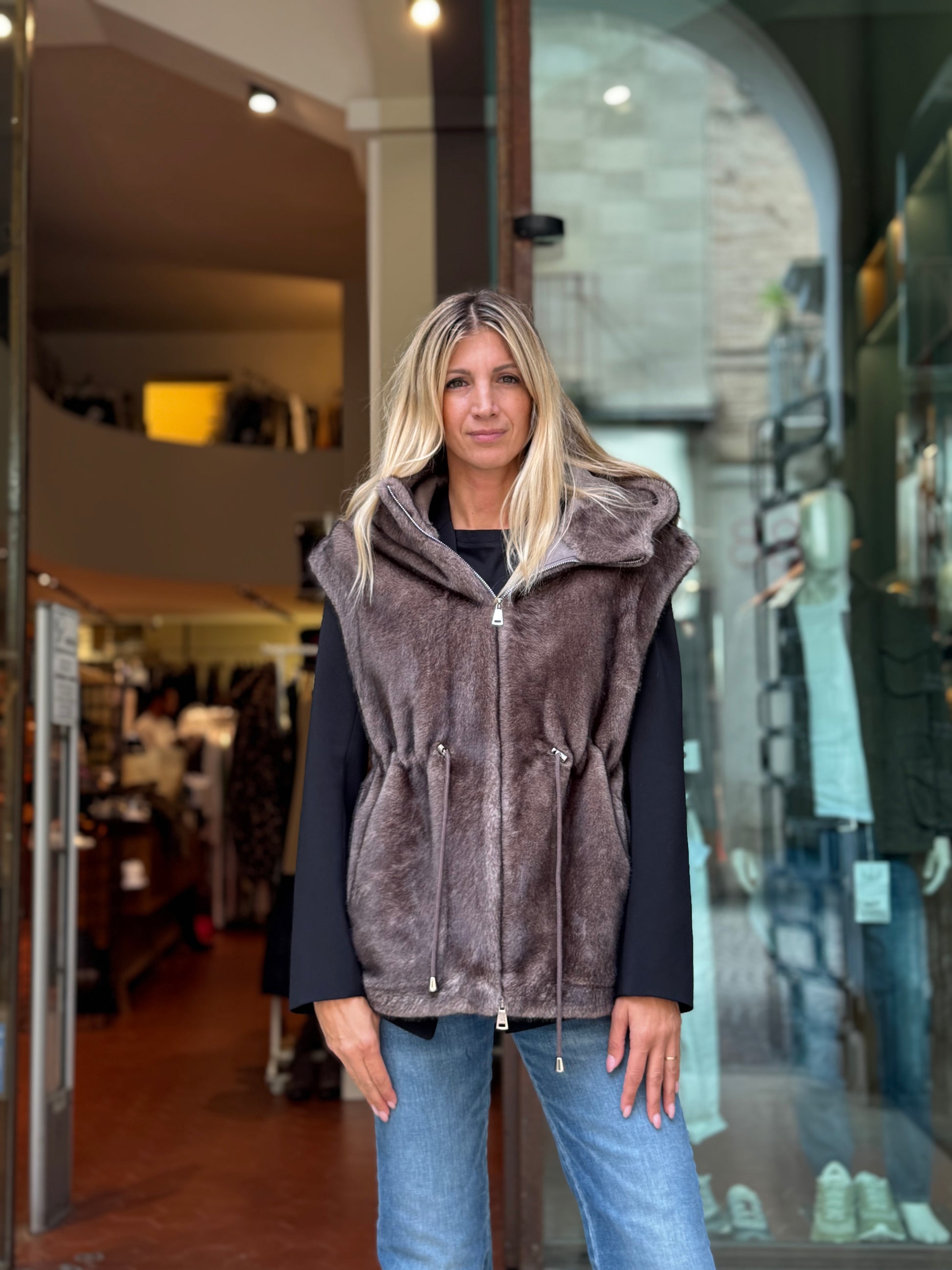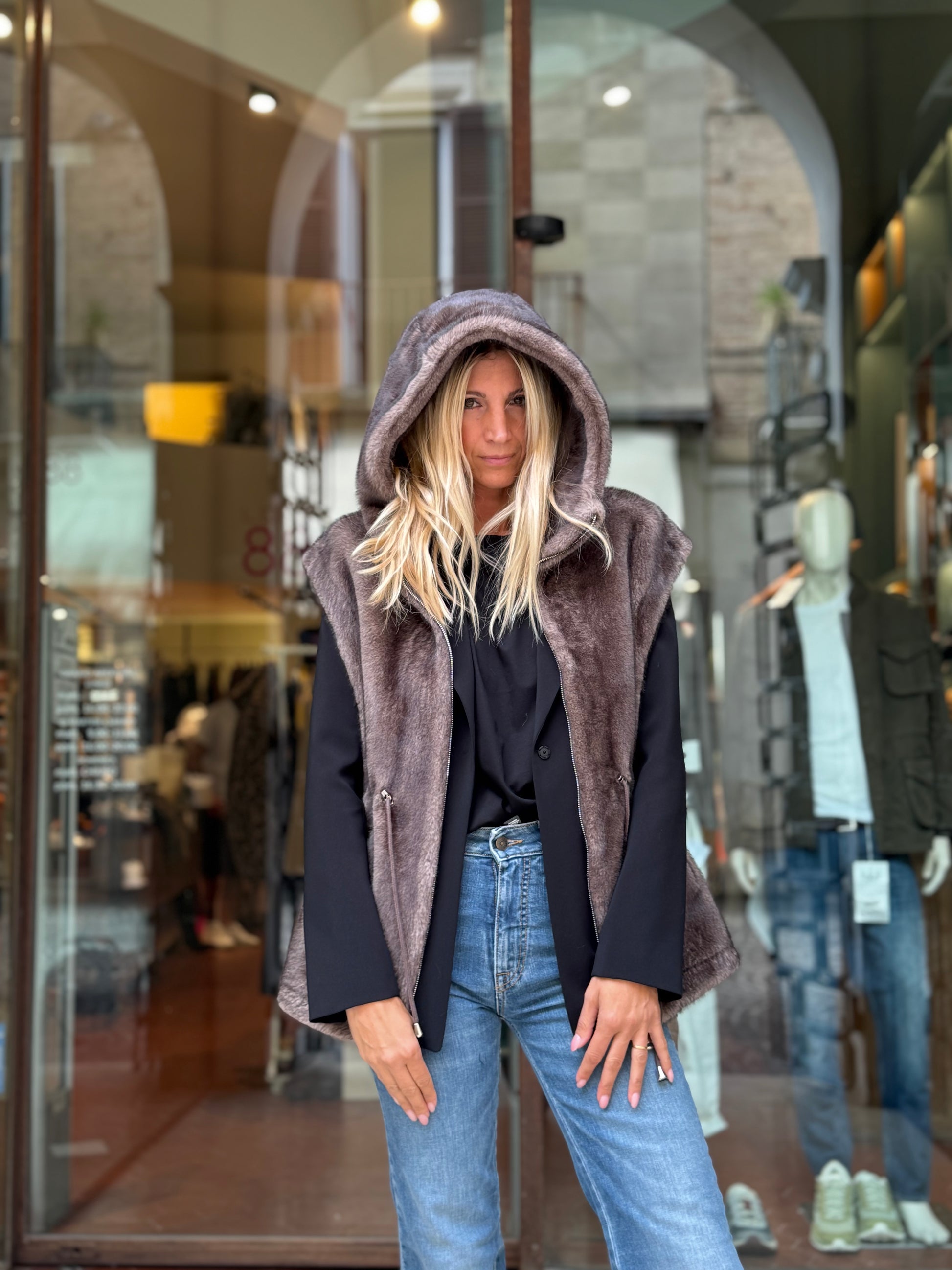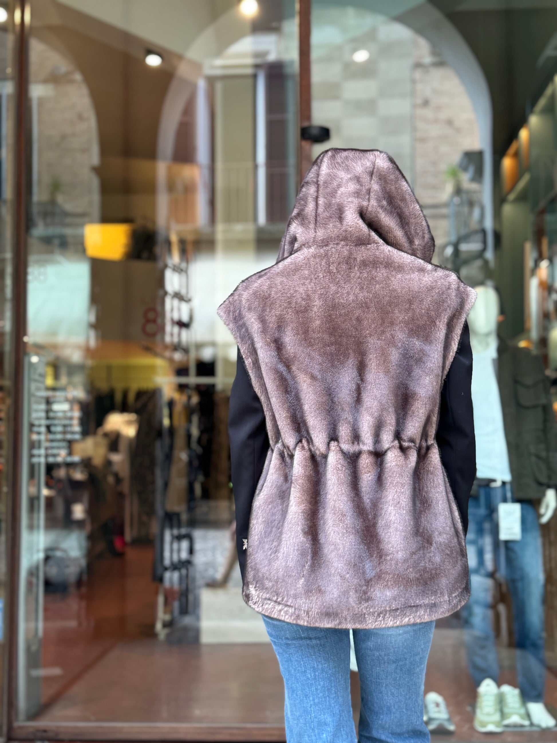 Betta Corradi Ecopelliccia smanicata con cappuccio FANGO