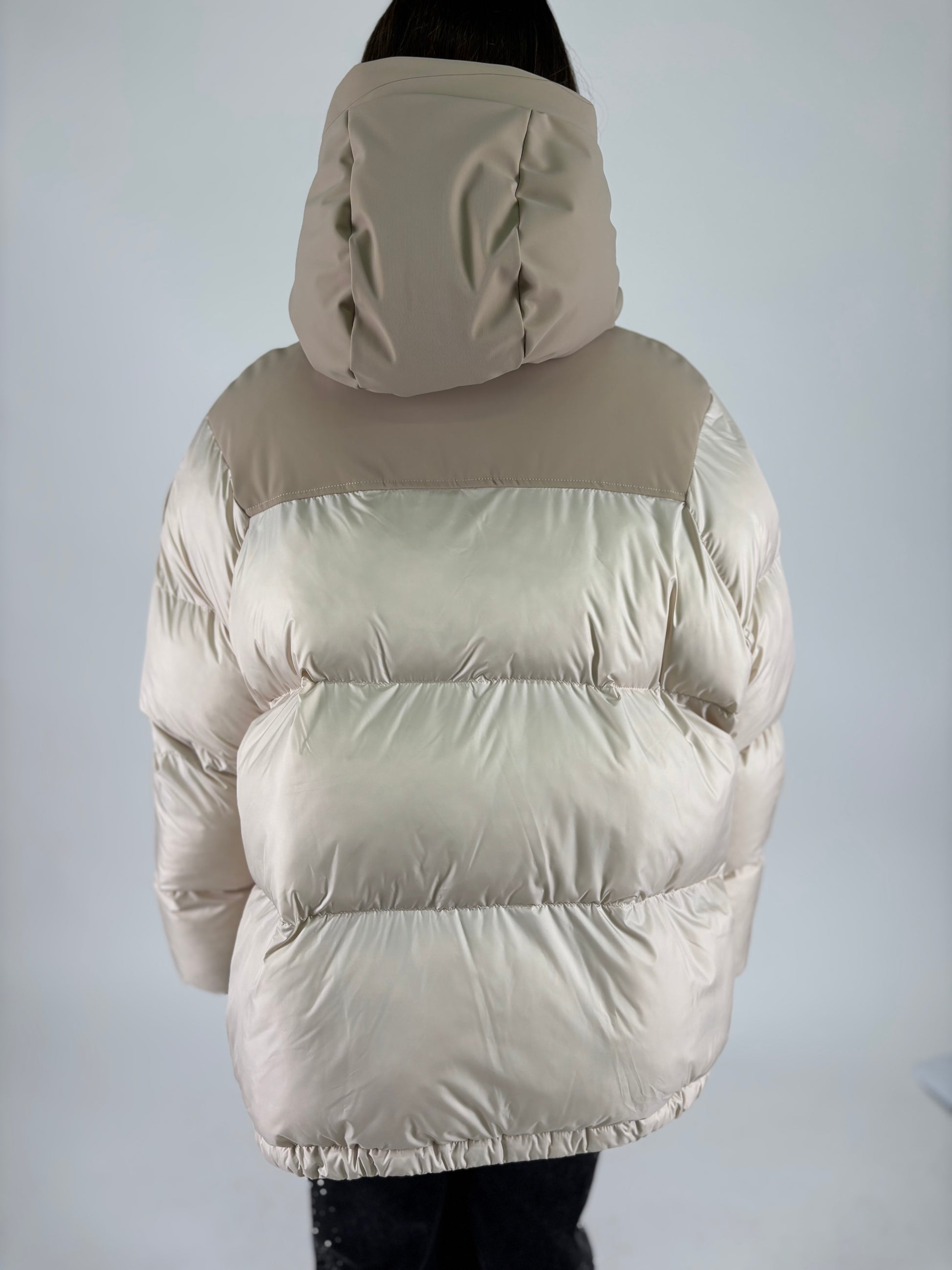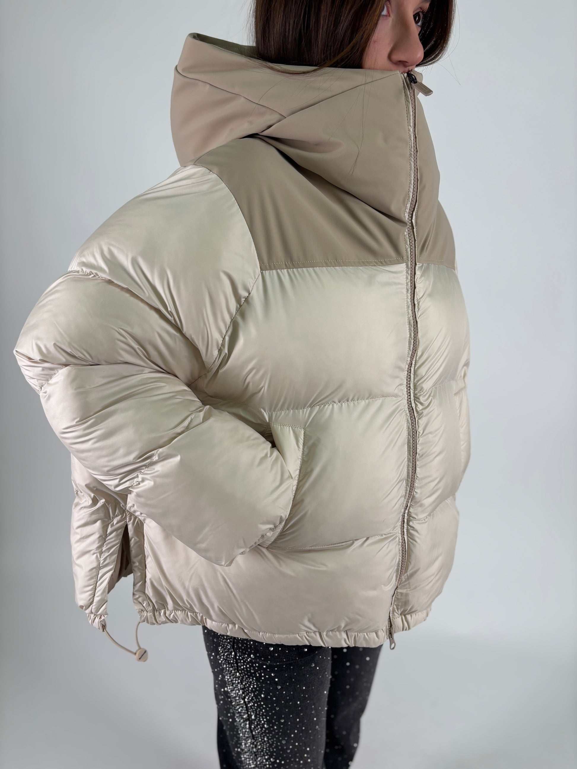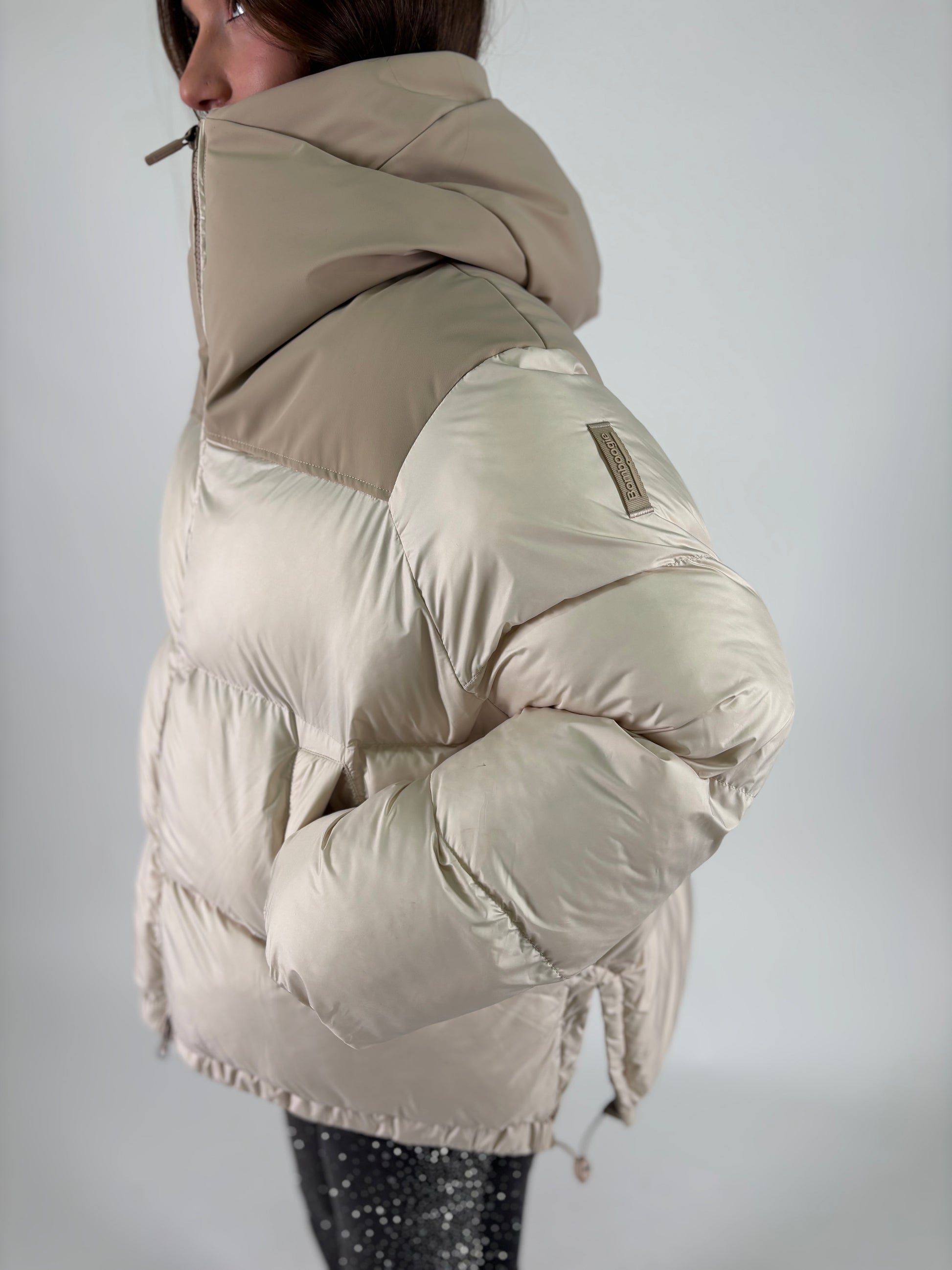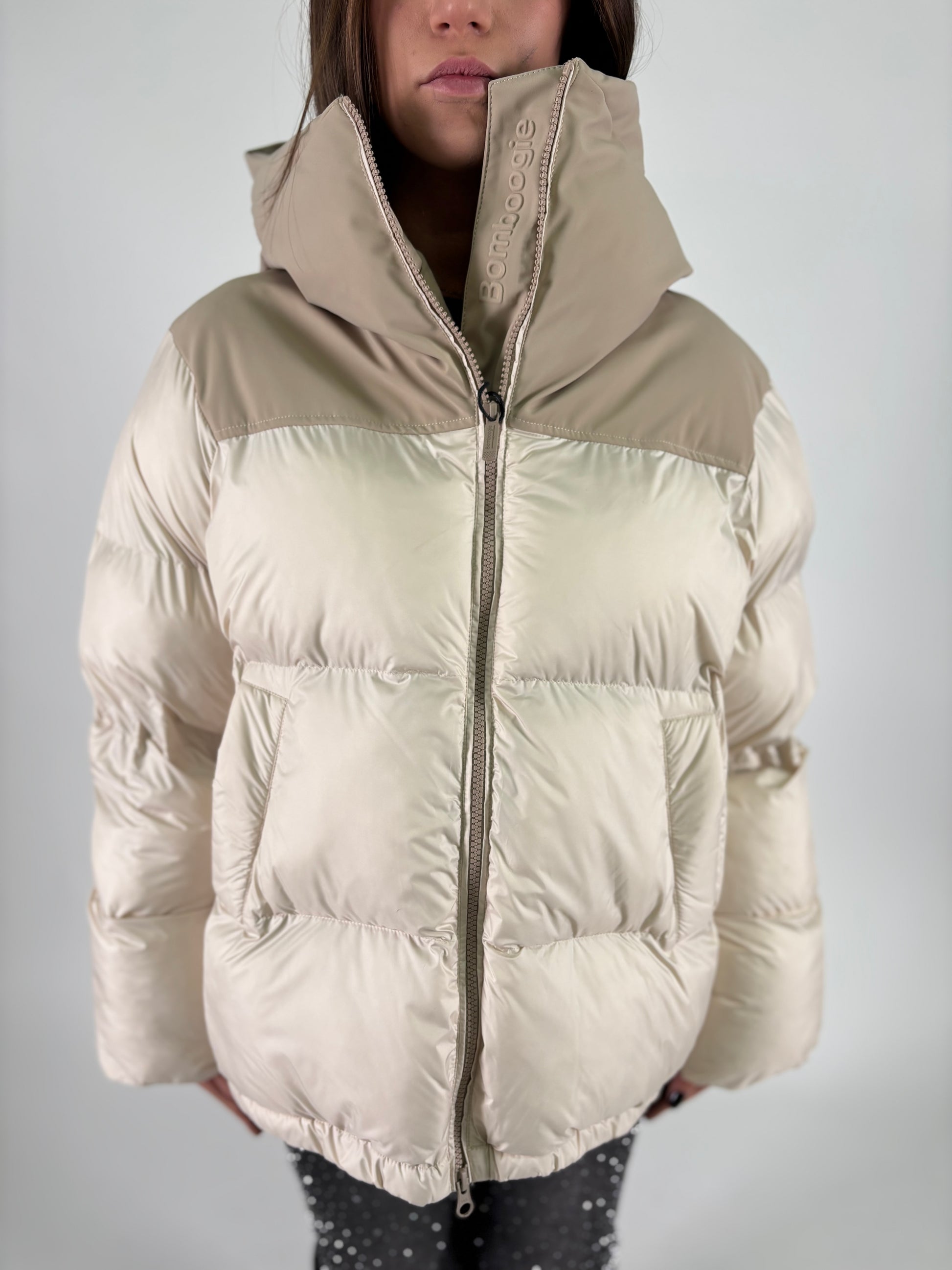 - Bomboogie Piumino corto con cappuccio con bottoncini laterali in tinta per apertura, allacciatura con zip argento a doppio cursore, tasche con zip invisibile, doppia taschina interna, una con zip e l' altra con bottone, interno in vera piuma