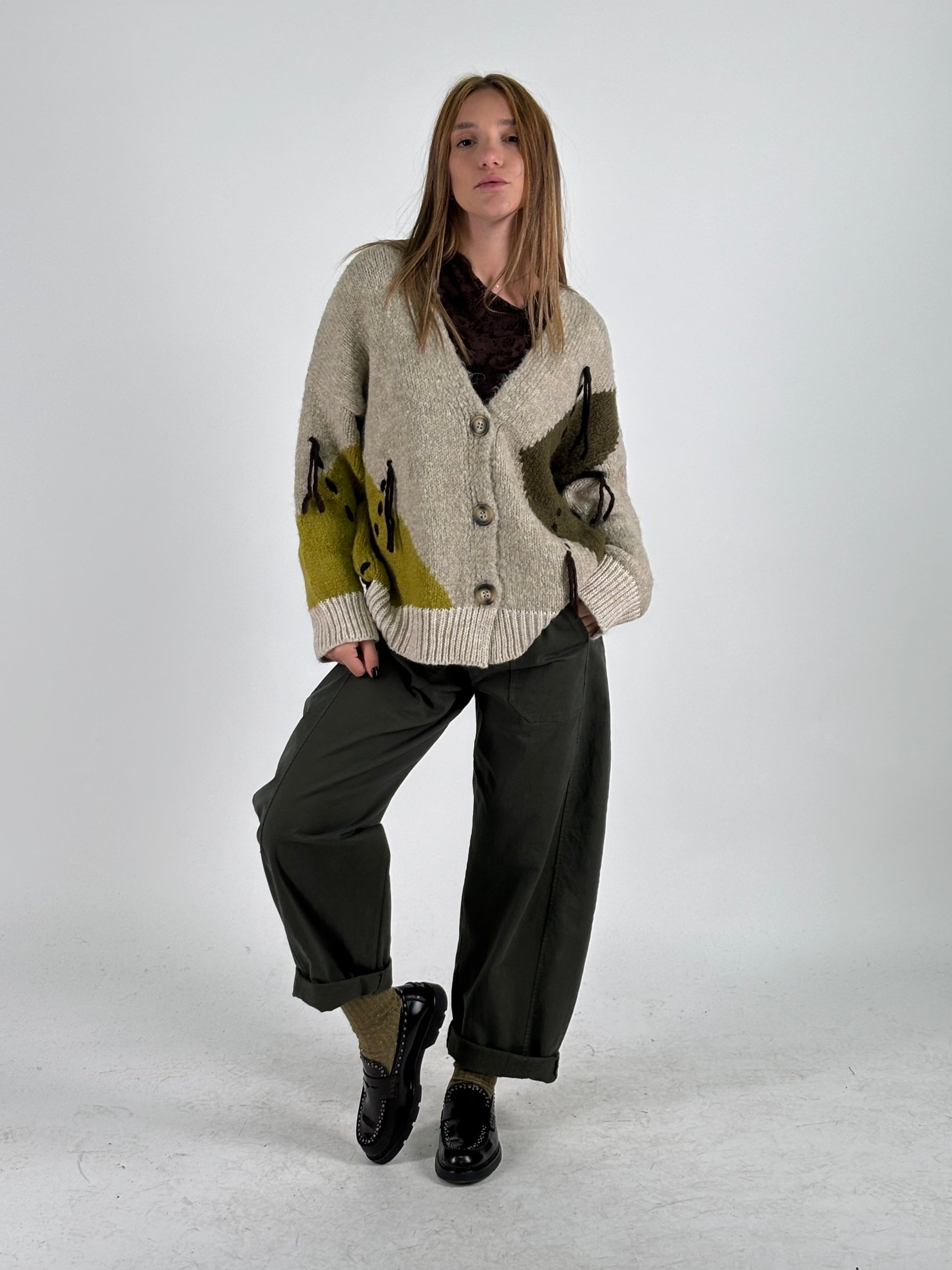 - Eco Cardigan cropped collo V base beige con dettagli verde lime e militare, modello tre bottoni