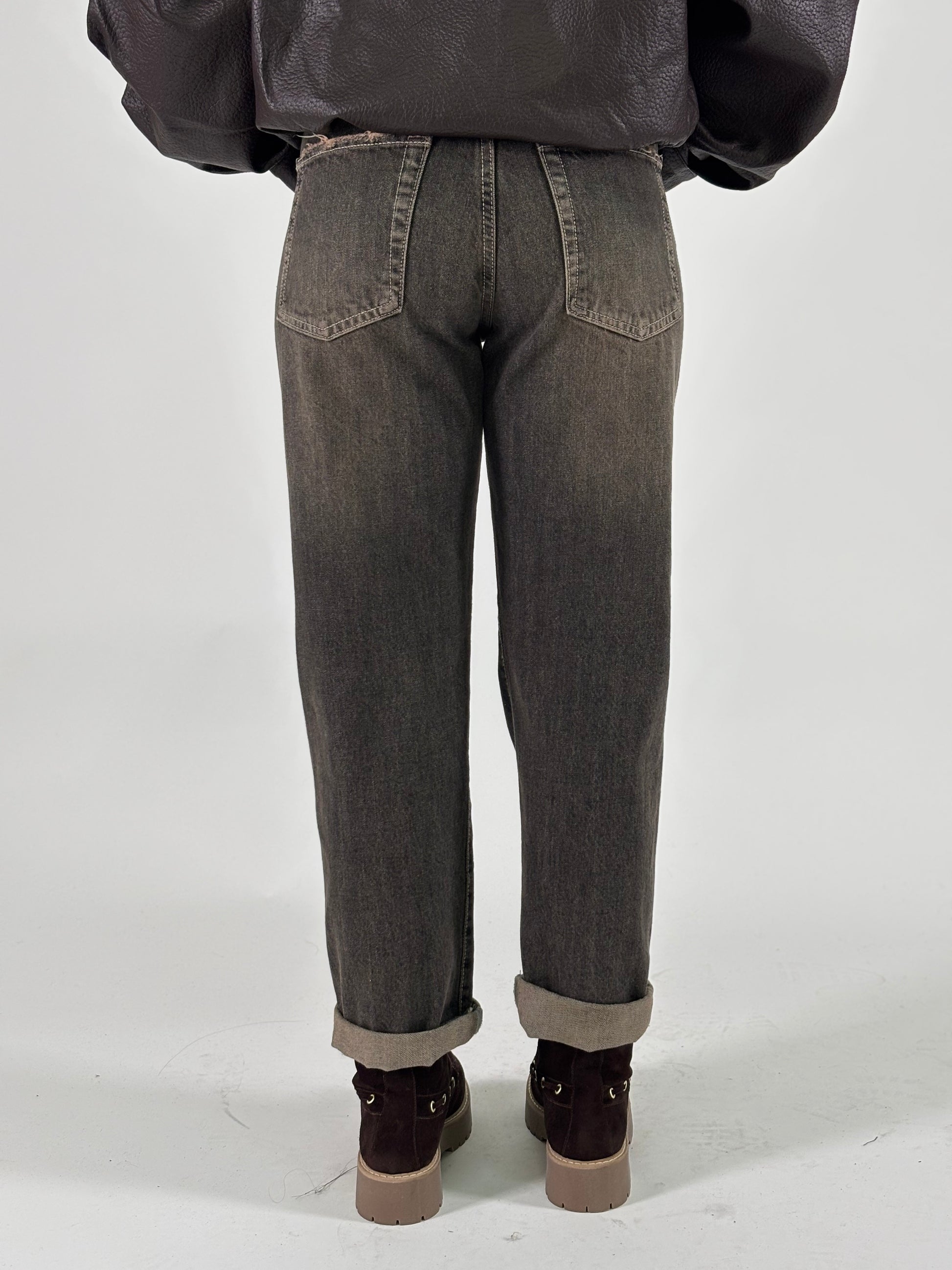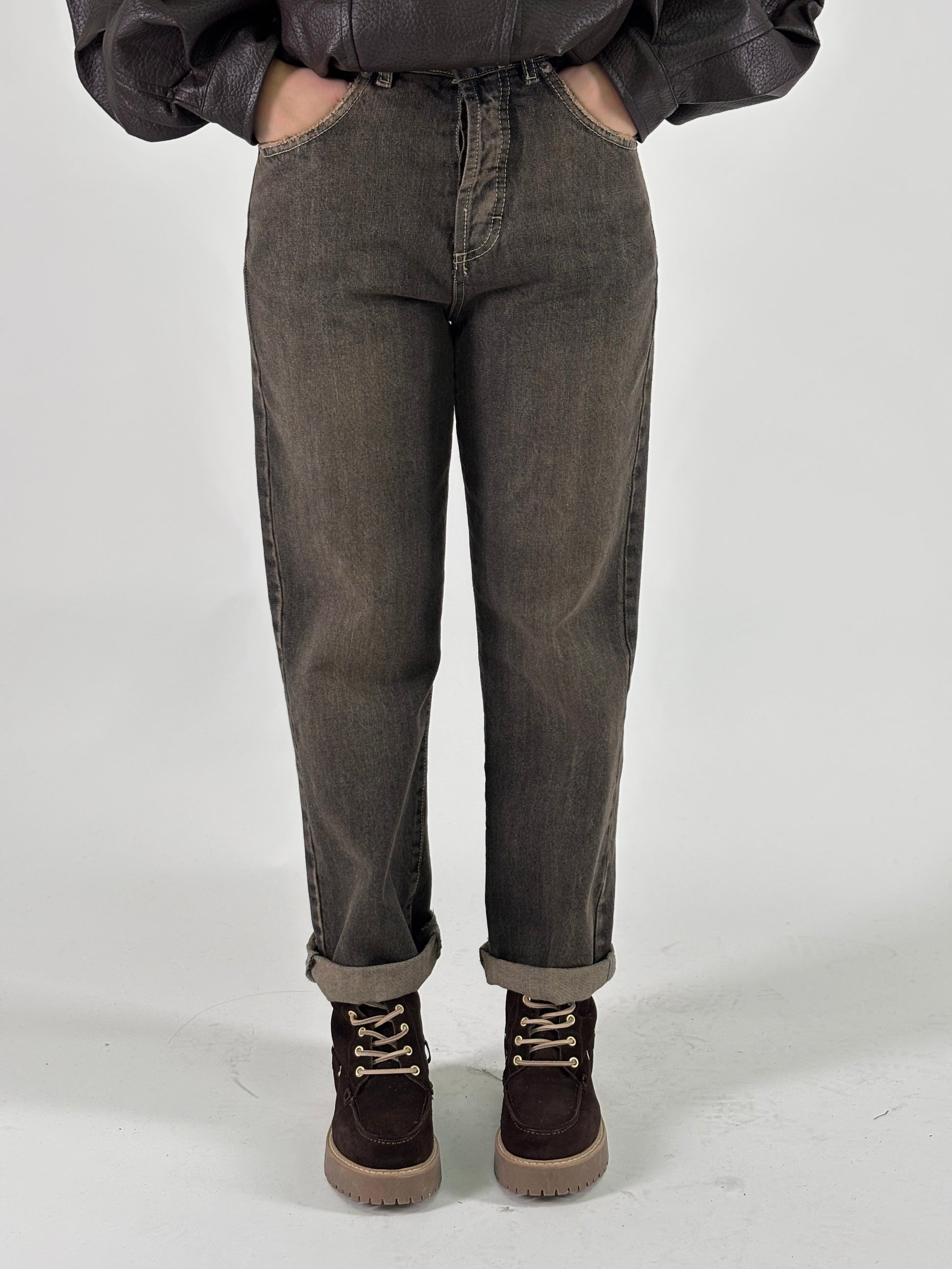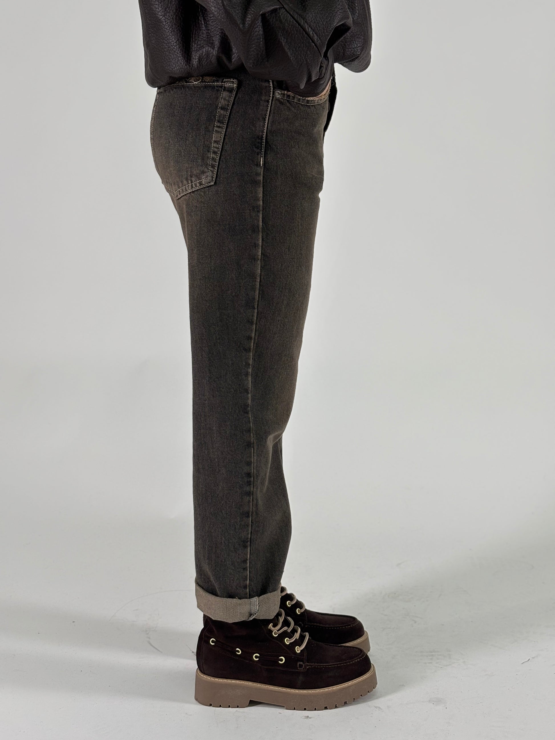 - Eco Jeans orlo e tasche effetto used, lavaggio vintage sabbiato, allacciatura ad un bottone più zip