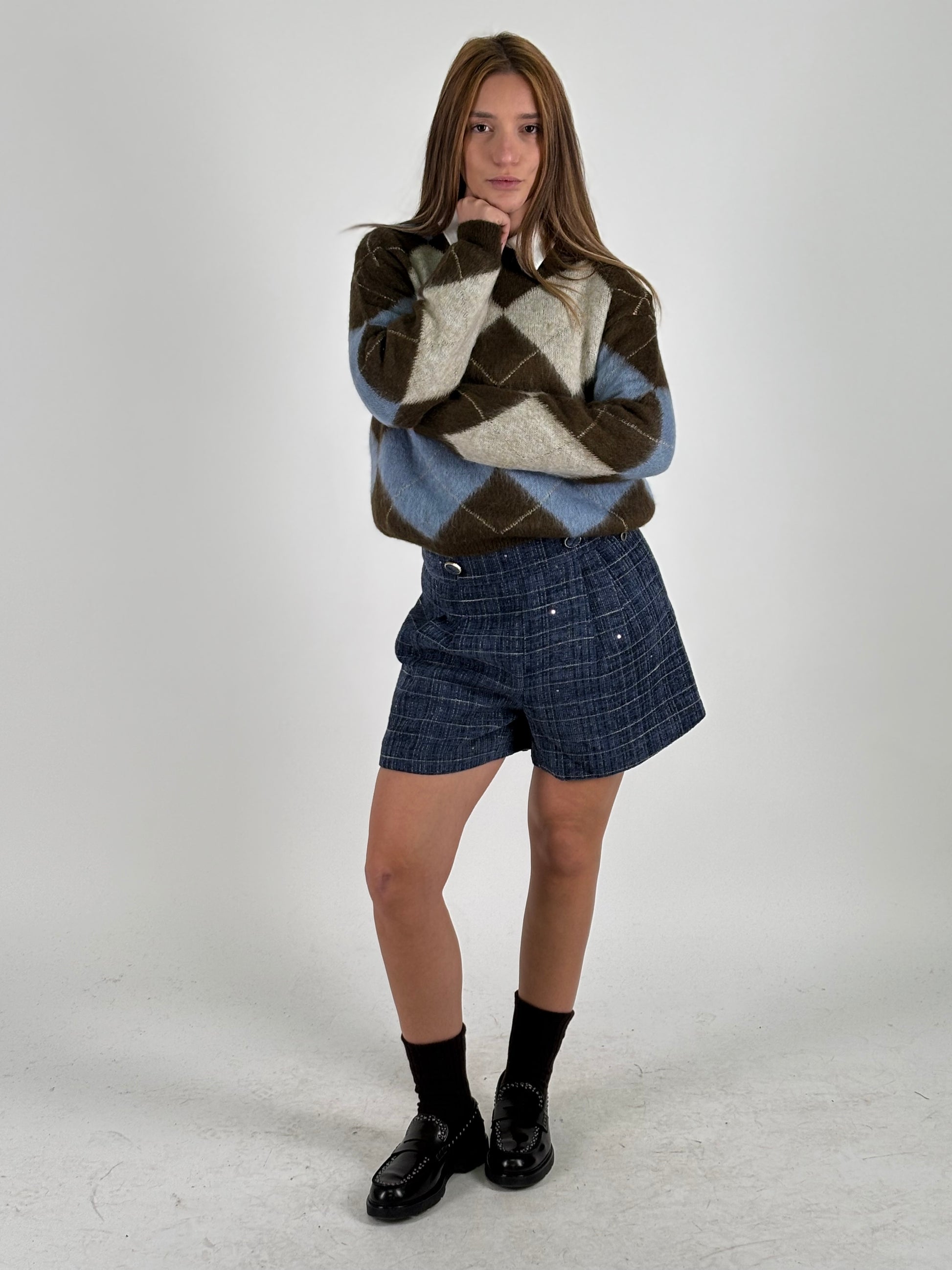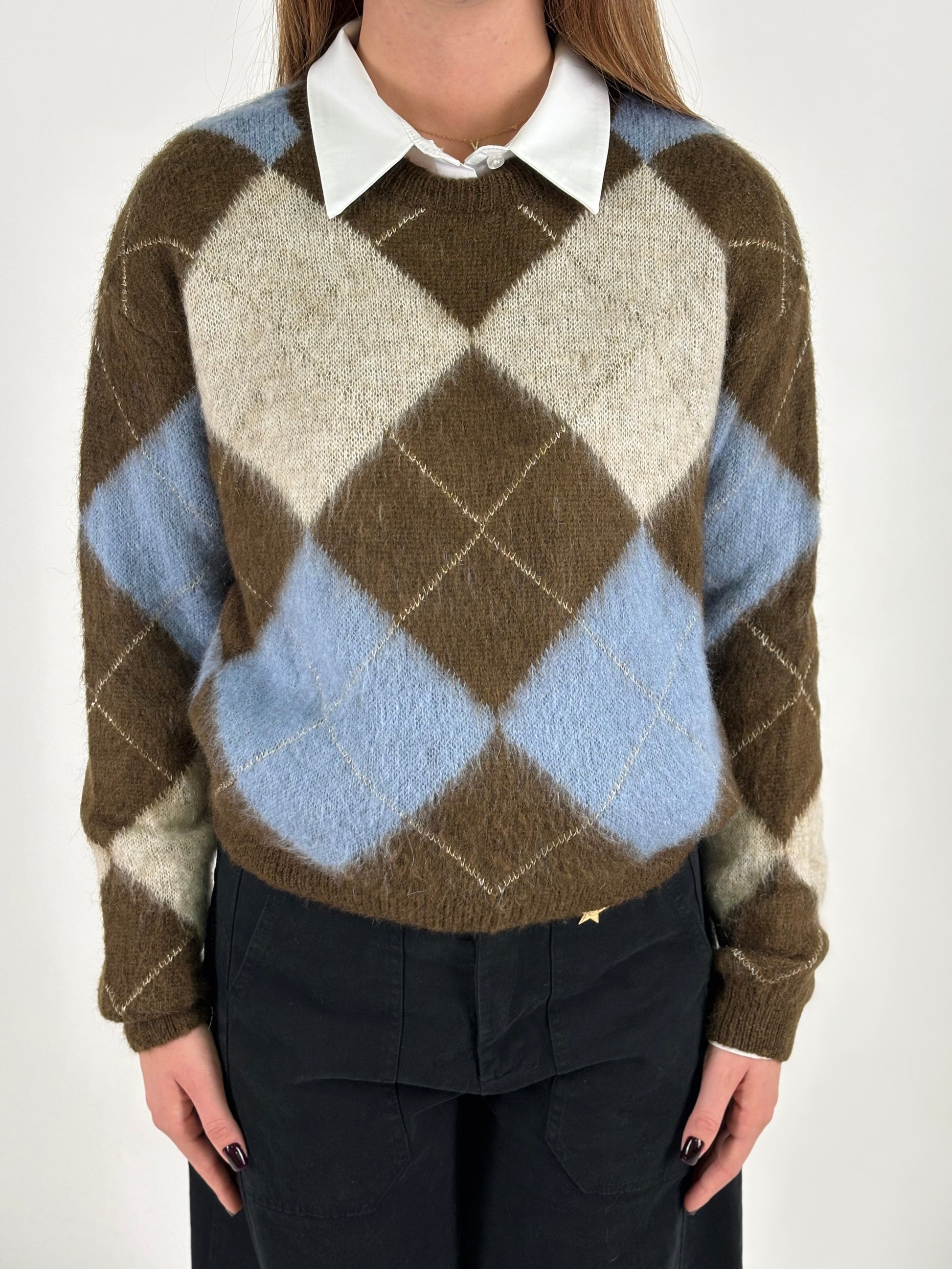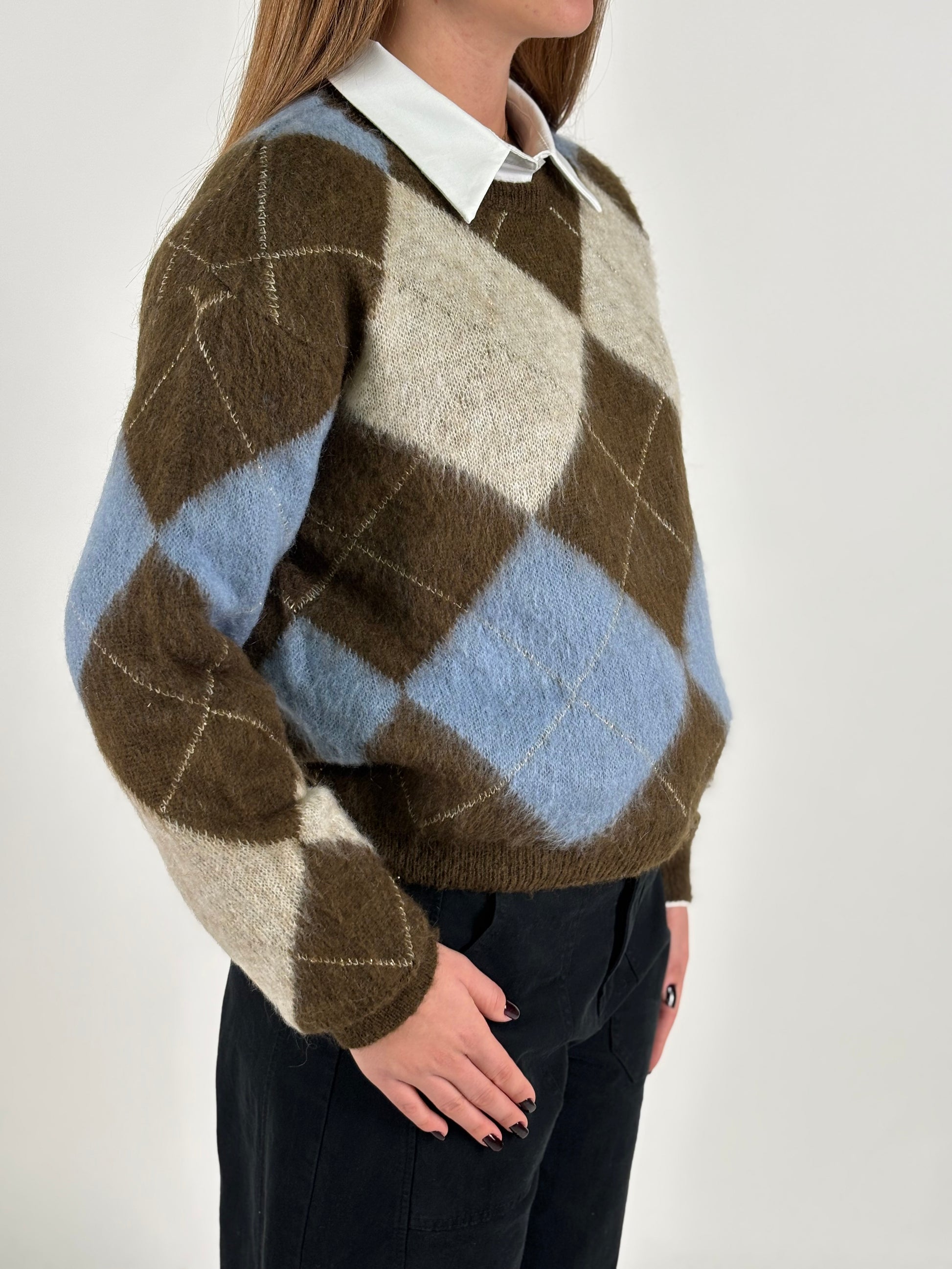- Eco Maglia intarsio rombi panna, marrone e celeste con filo lurex oro, modello ml girocollo