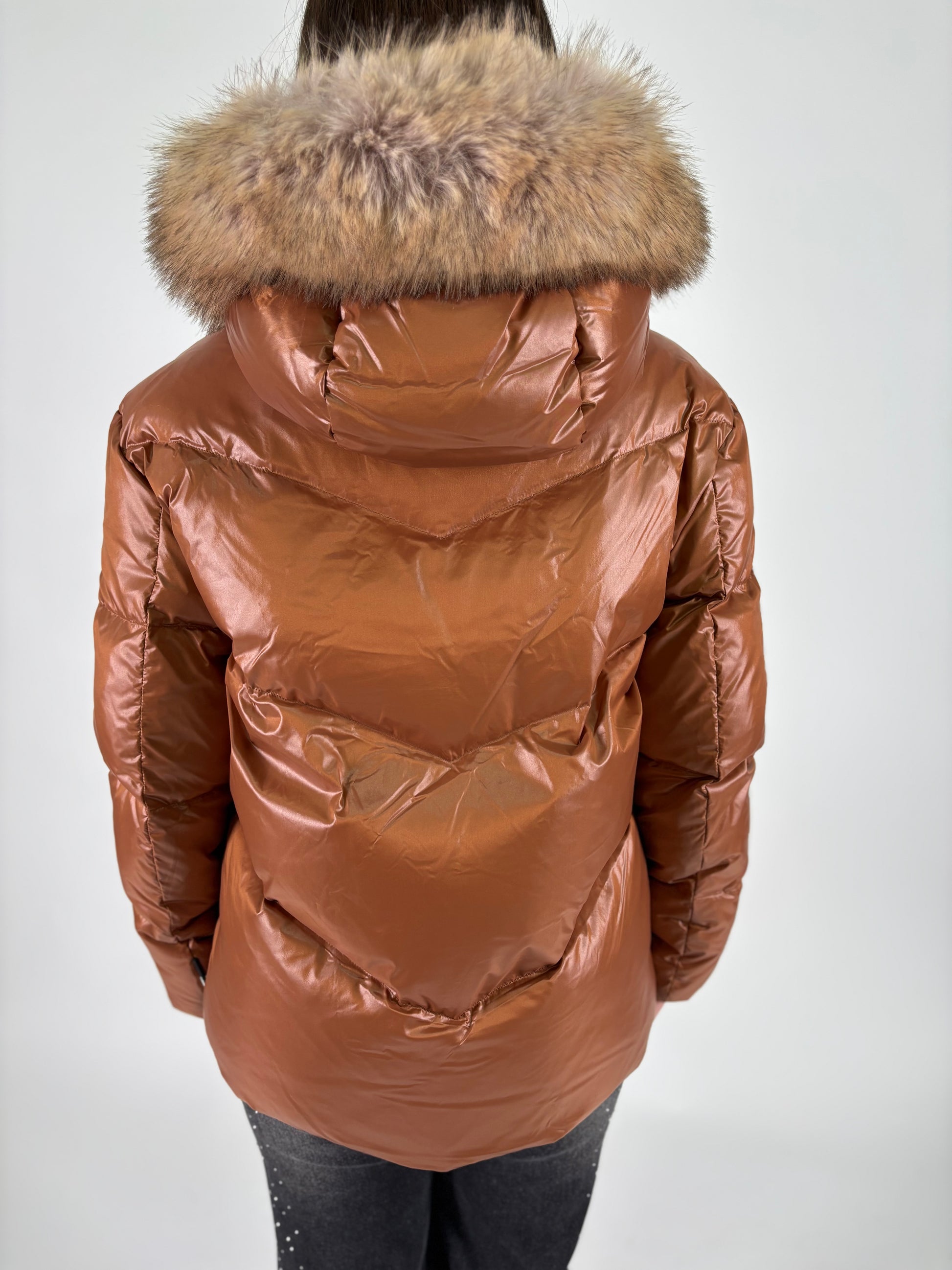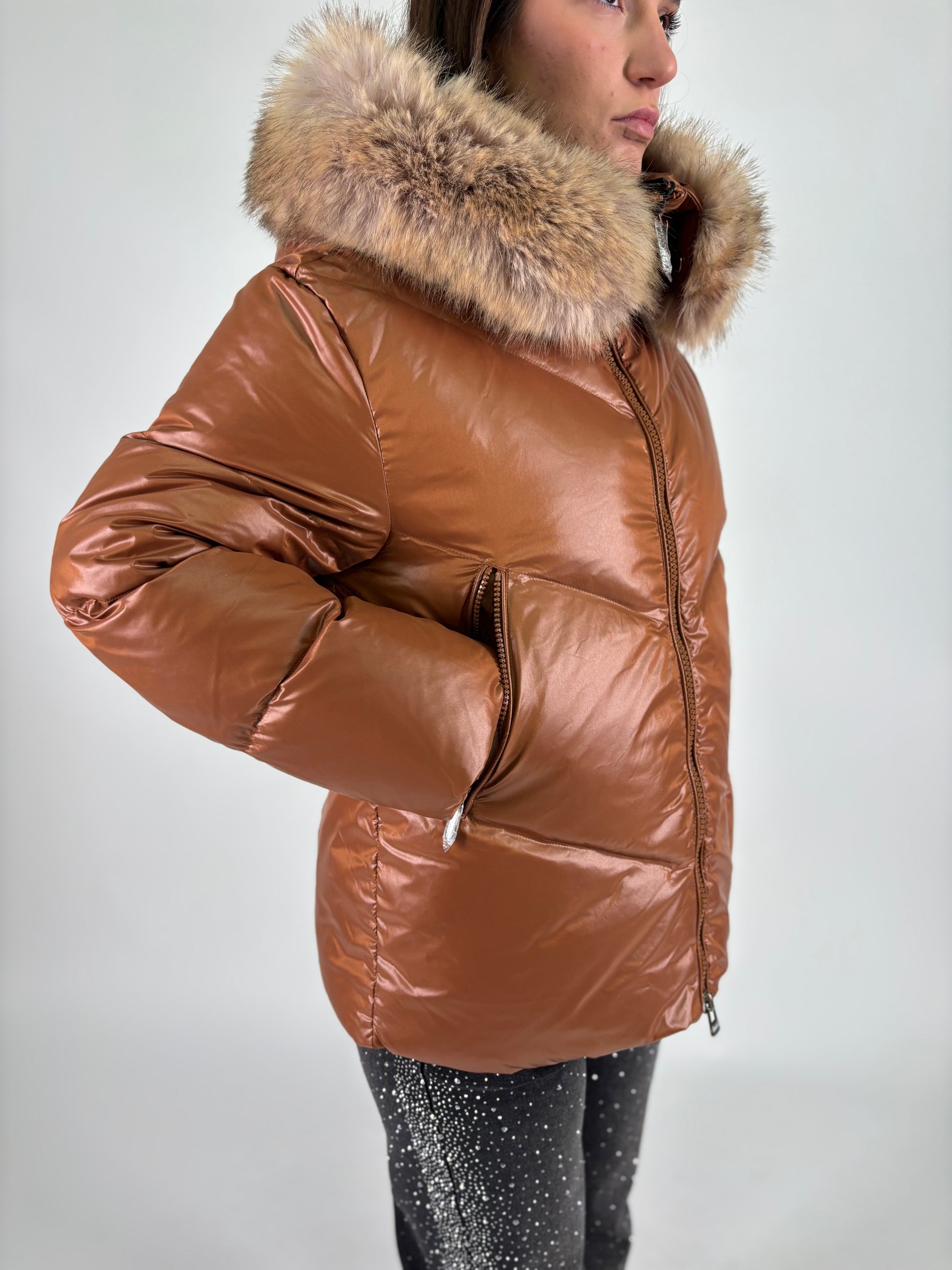 FREEDOMDAY piumino VERO corto con cappuccio ecopelliccia CARAMELLO