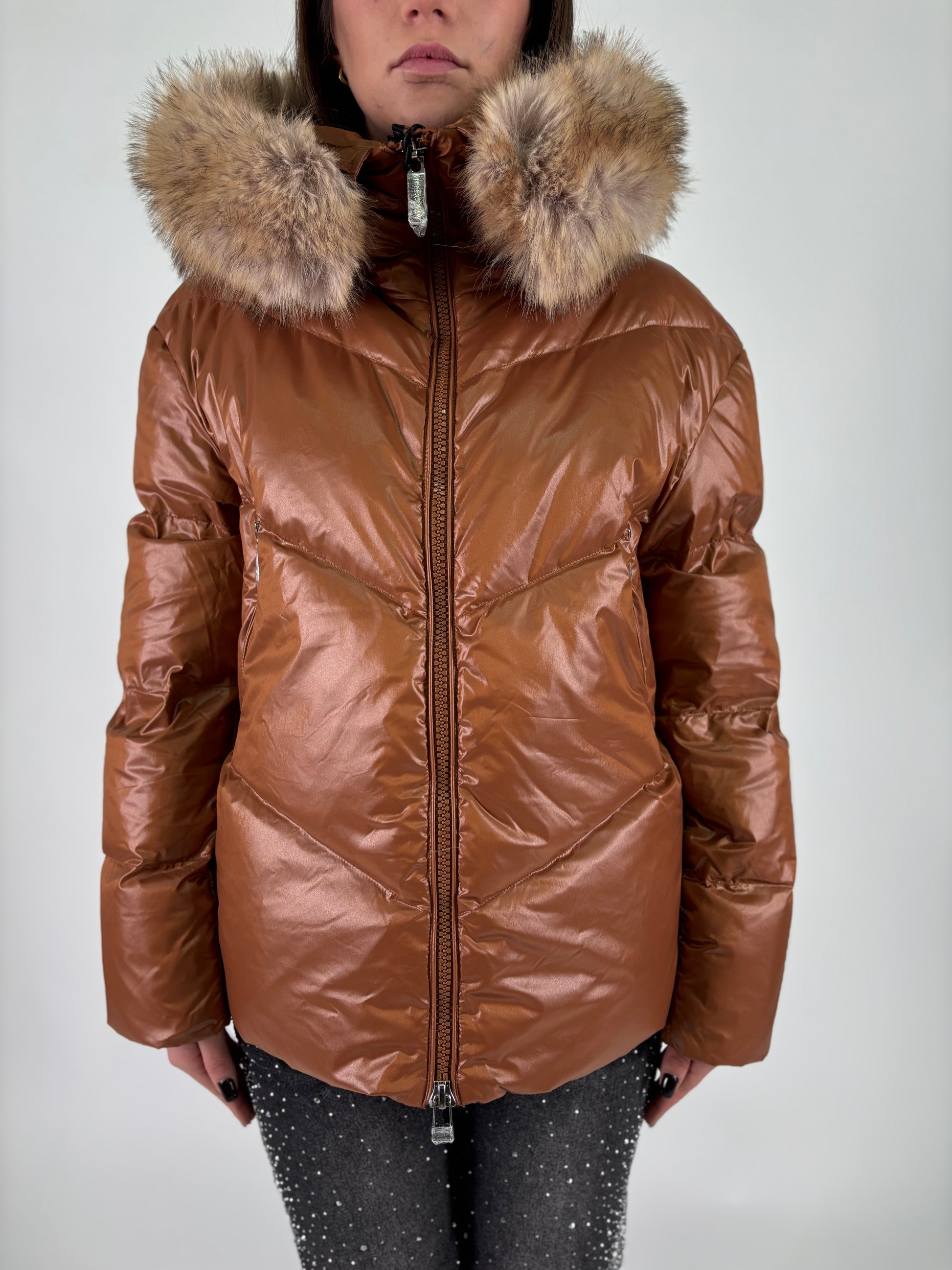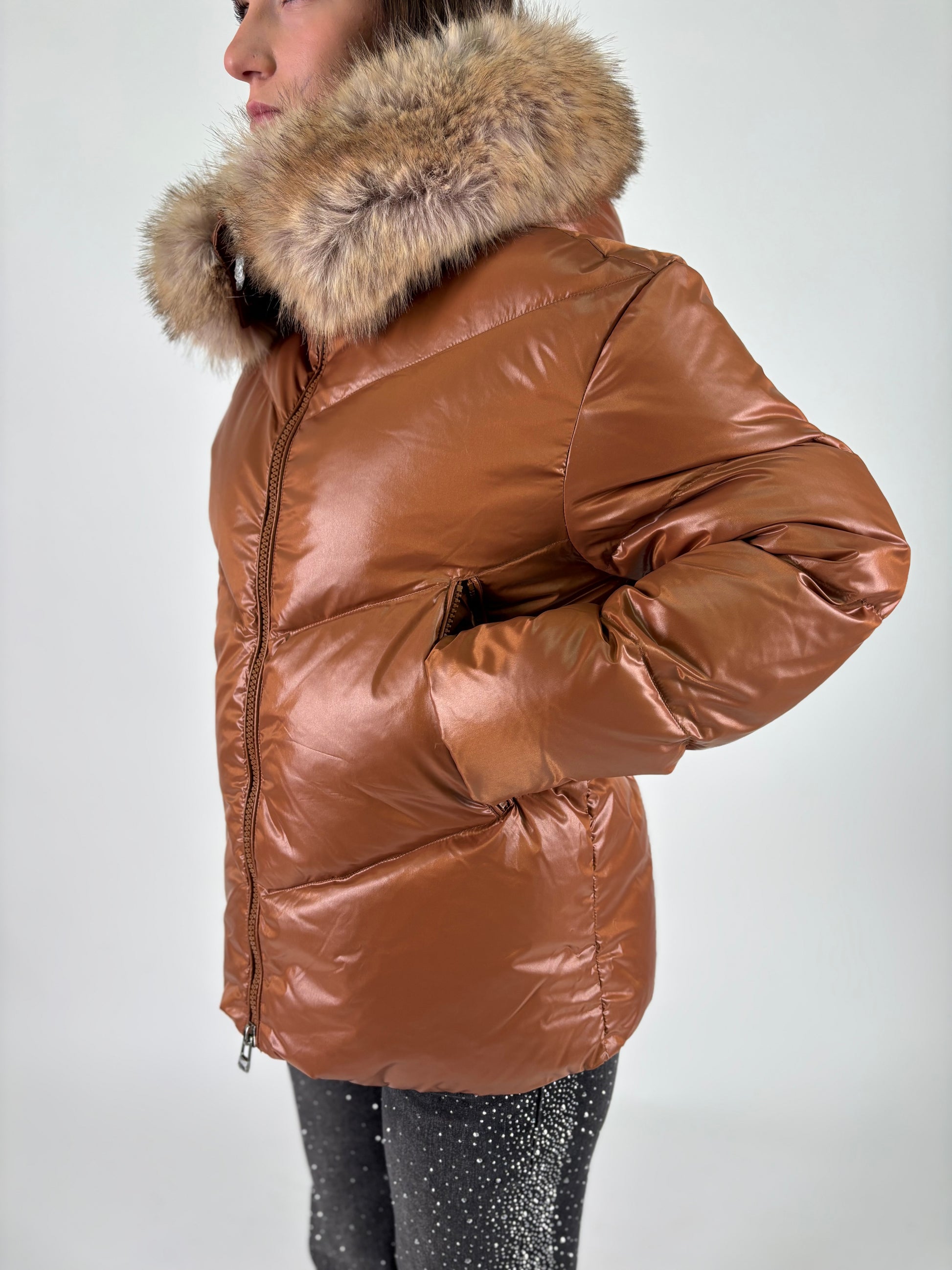 FREEDOMDAY piumino corto con cappuccio ecopelliccia CARAMELLO