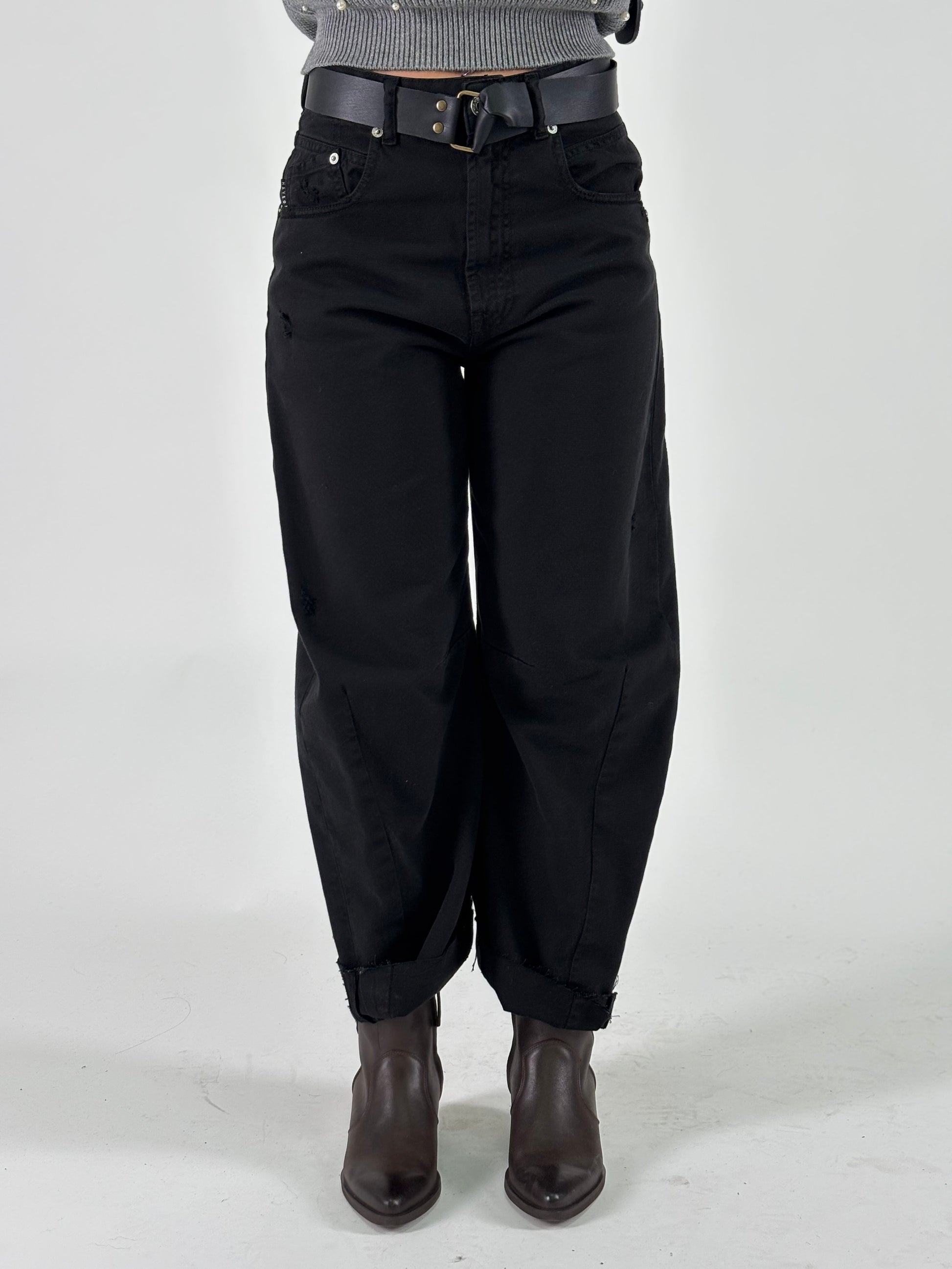 - Haveone Jeans barbara in tela ferma modello ballon con cucitura all' altezza del ginocchio e leggeri strappeti nelle tasche davanti, bottone in metallo argento e zip a scomparsa.