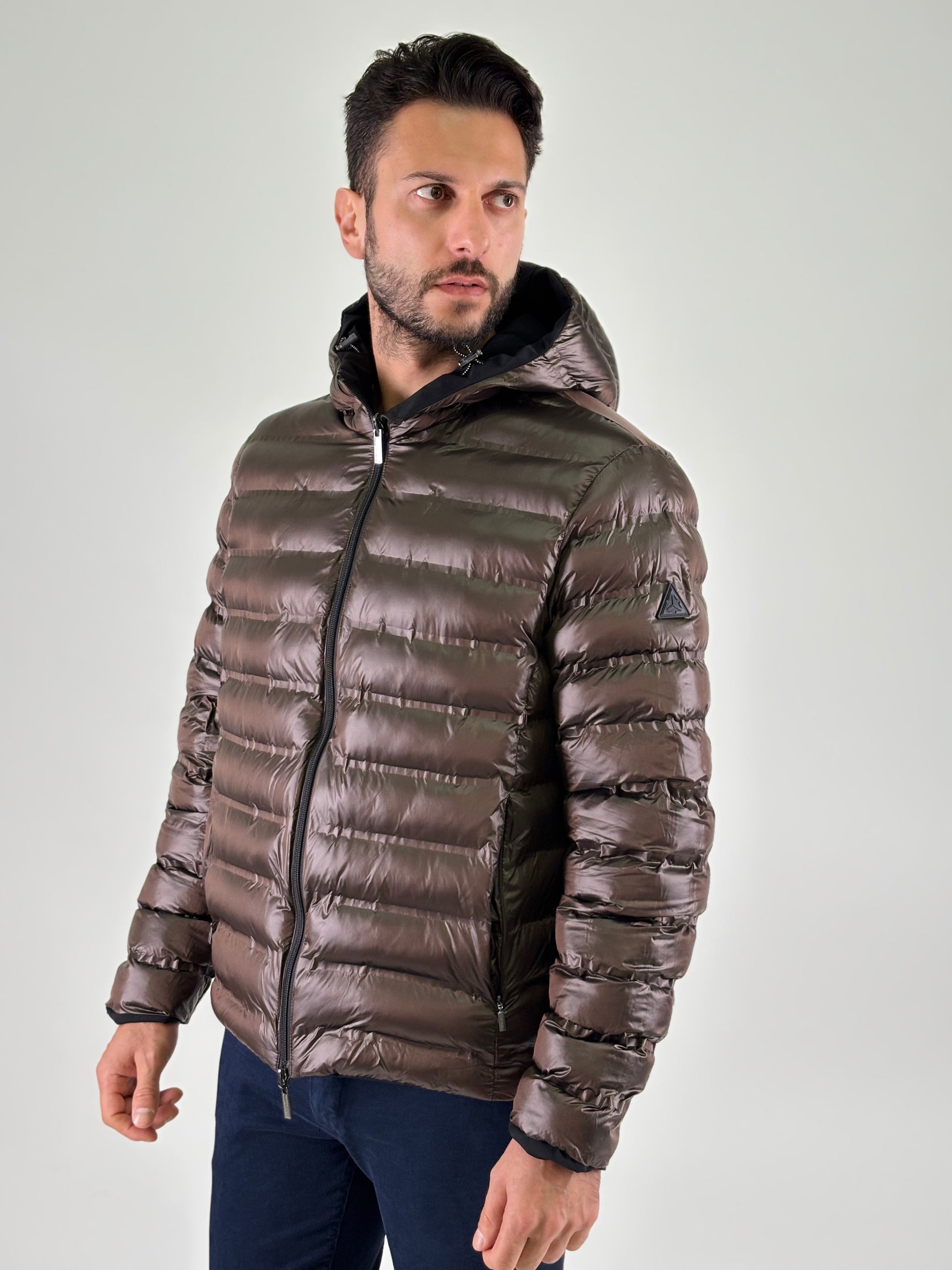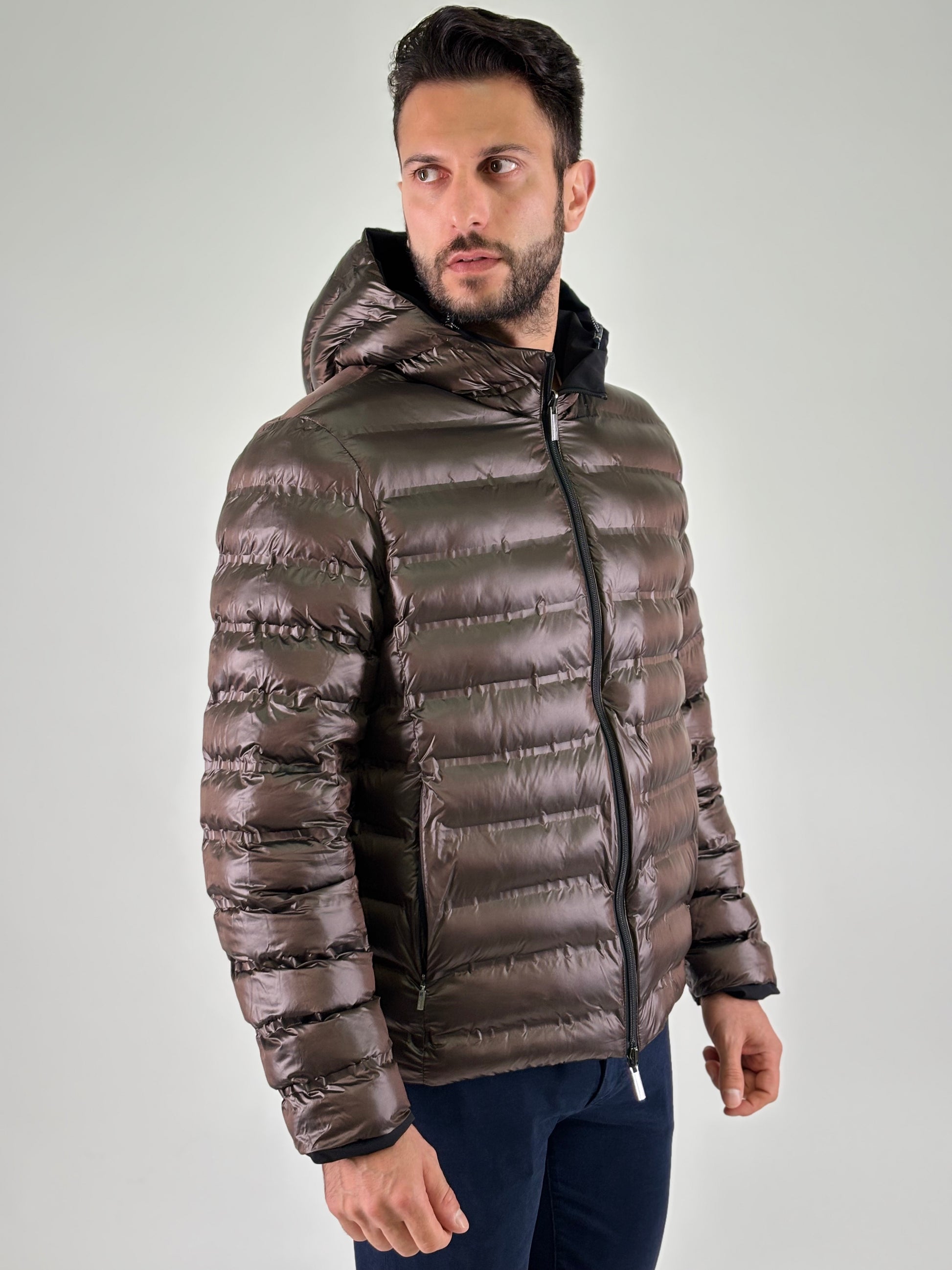 - Heskimo Piumino corto reversibile con cappuccio, esterno in tessuto softshell con zip, anti vento e acqua, ermetiche anche nelle tasche, interno piumino marrone con imbottitura Sorona isolante. Zip con doppio cursore, cappuccio fisso