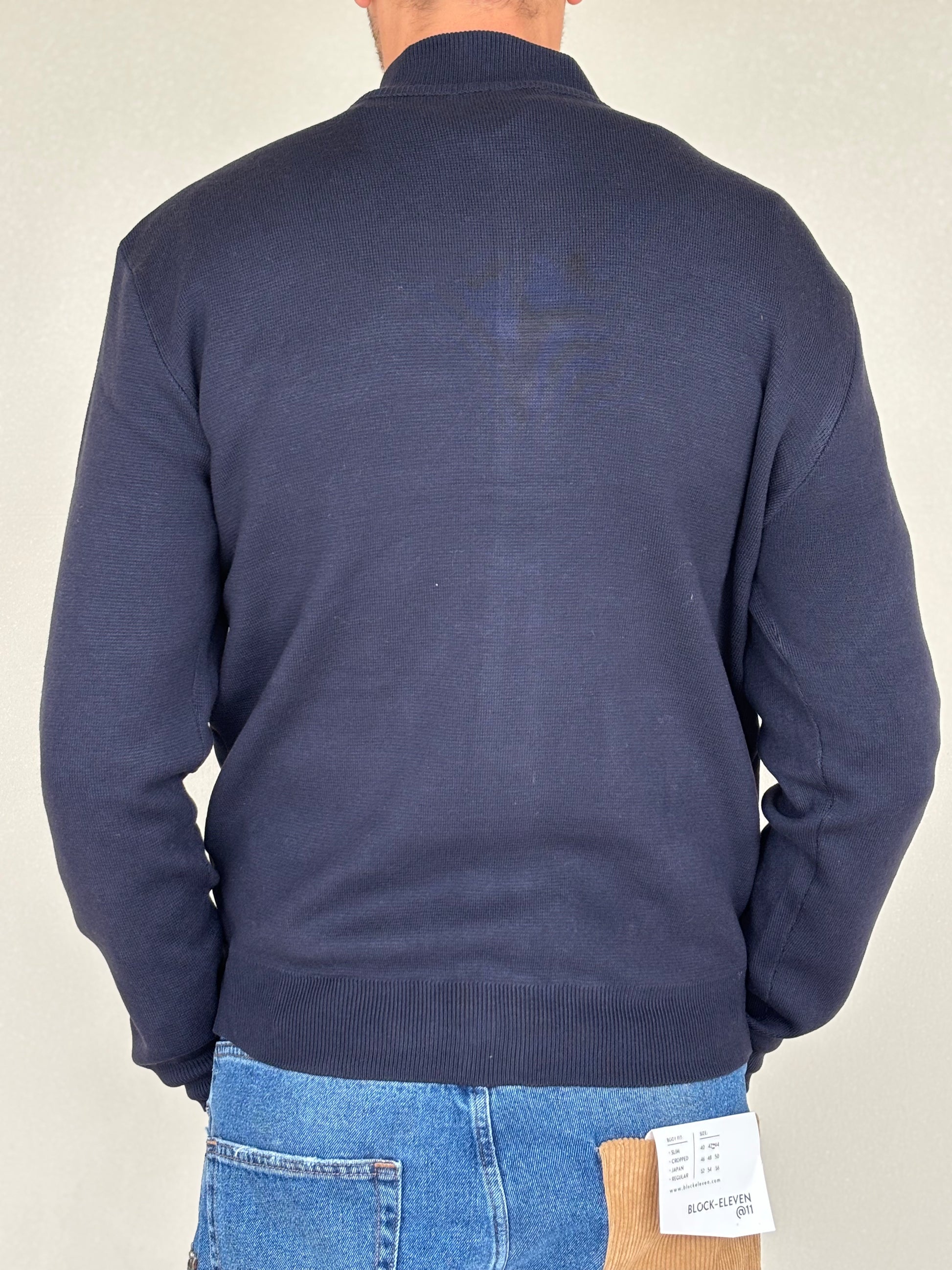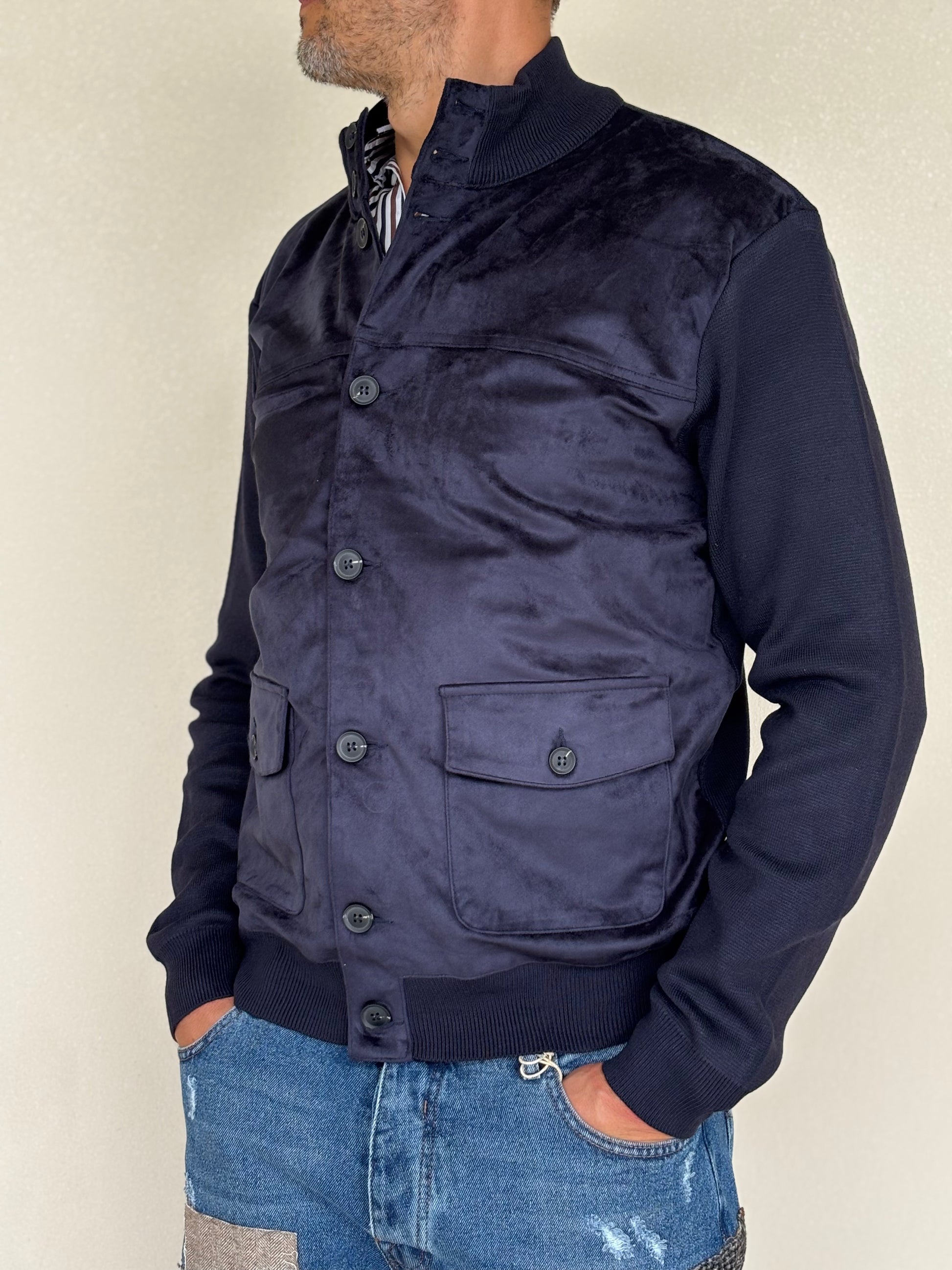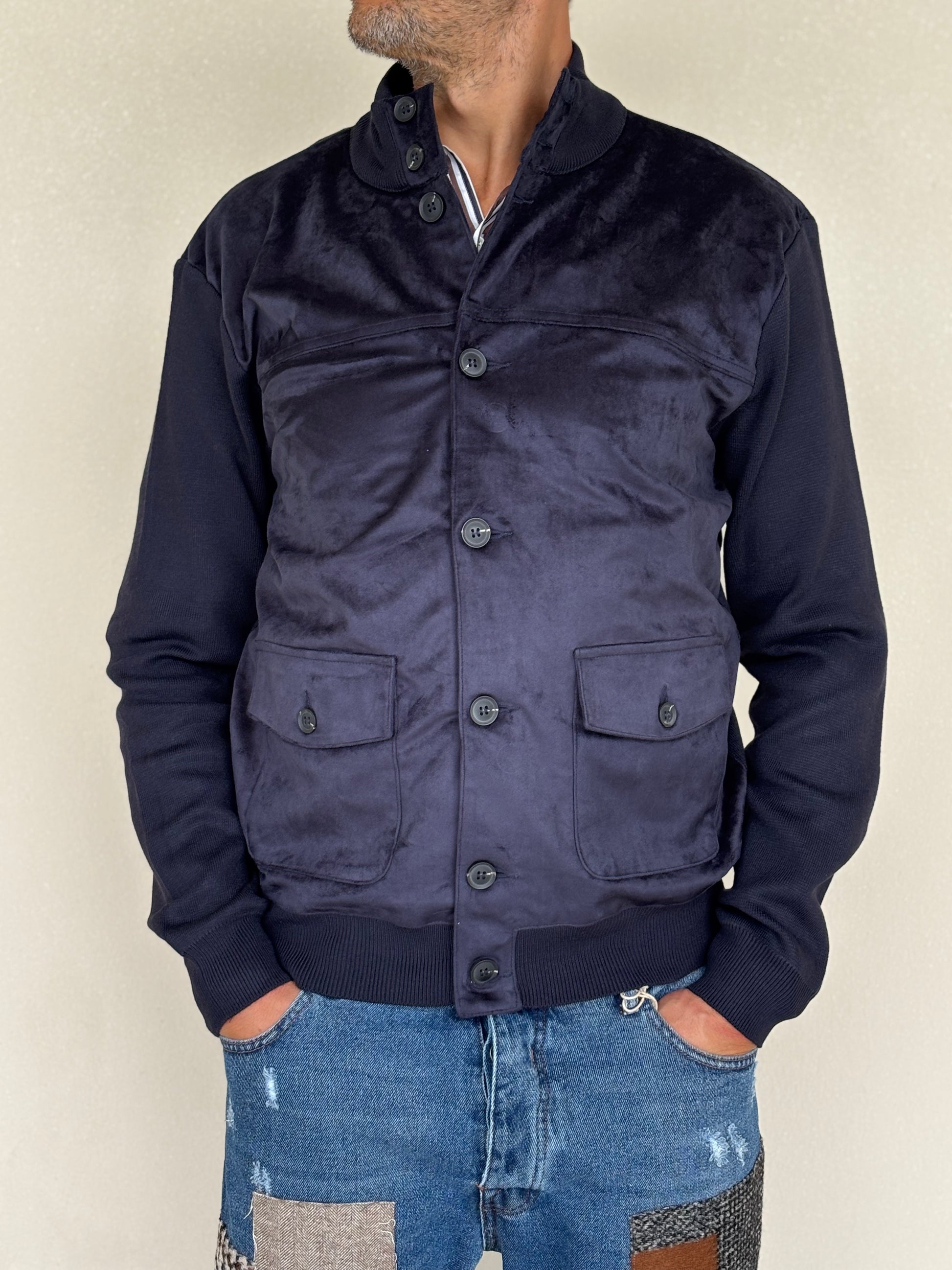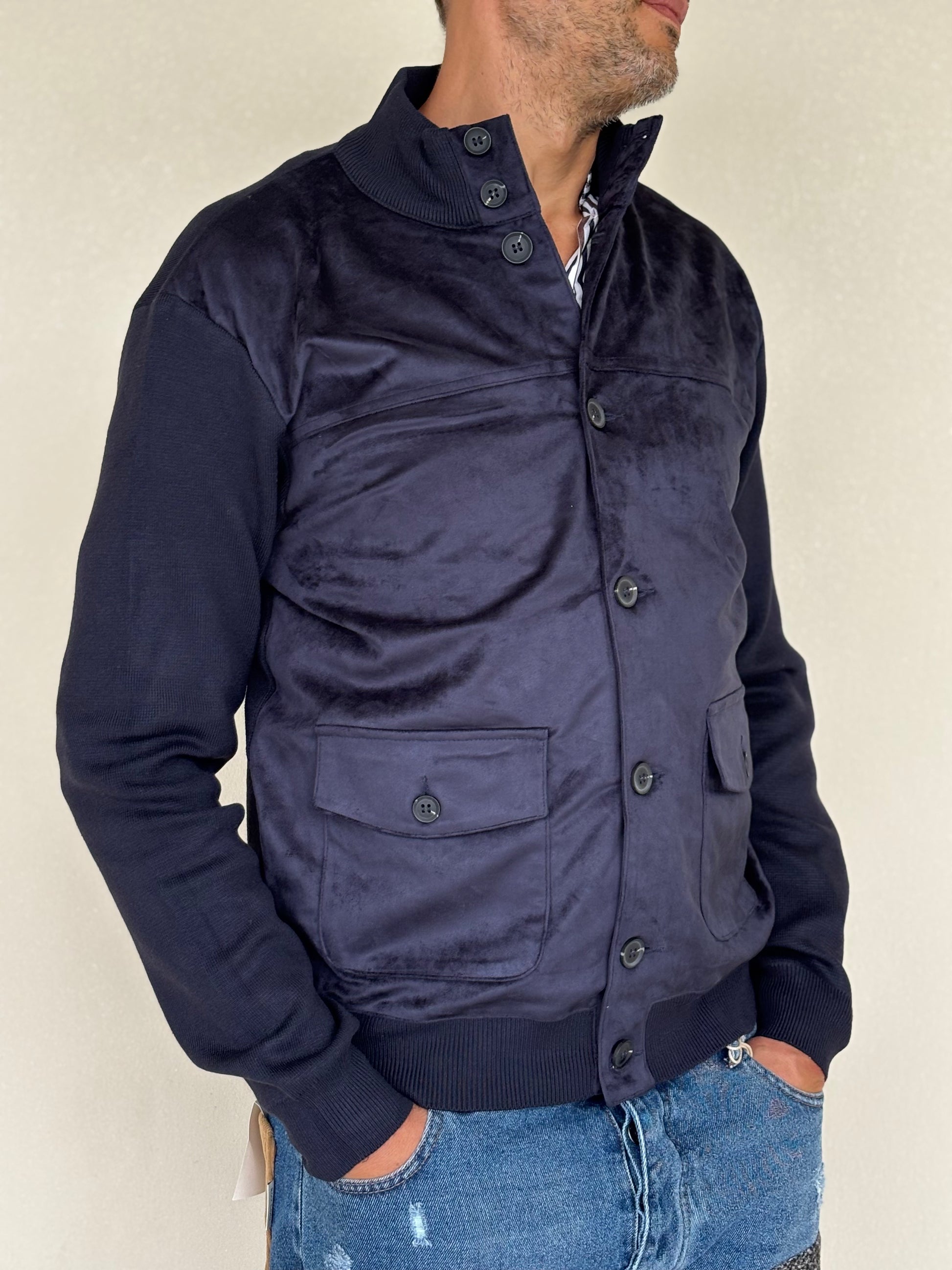 - Loft88 Giaccamaglia simil dainetto davanti con tasche toppa e in maglia dietro come le maniche, modello con mezzo collo, fodera interna blu solo nella parte davanti