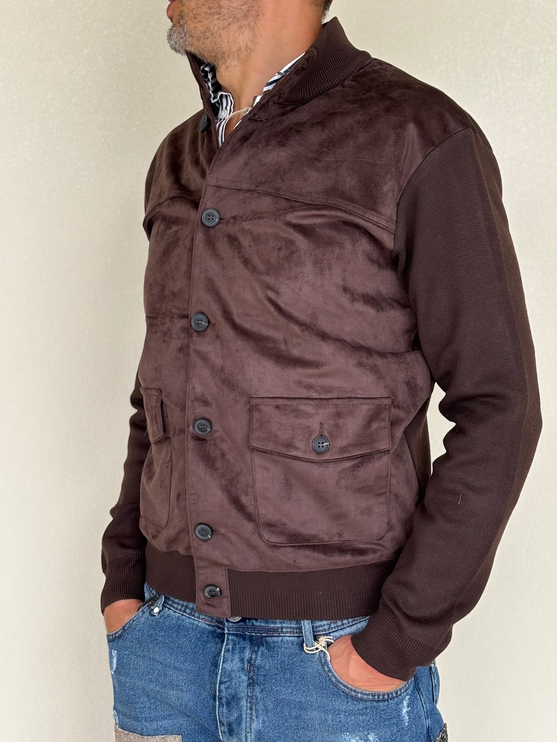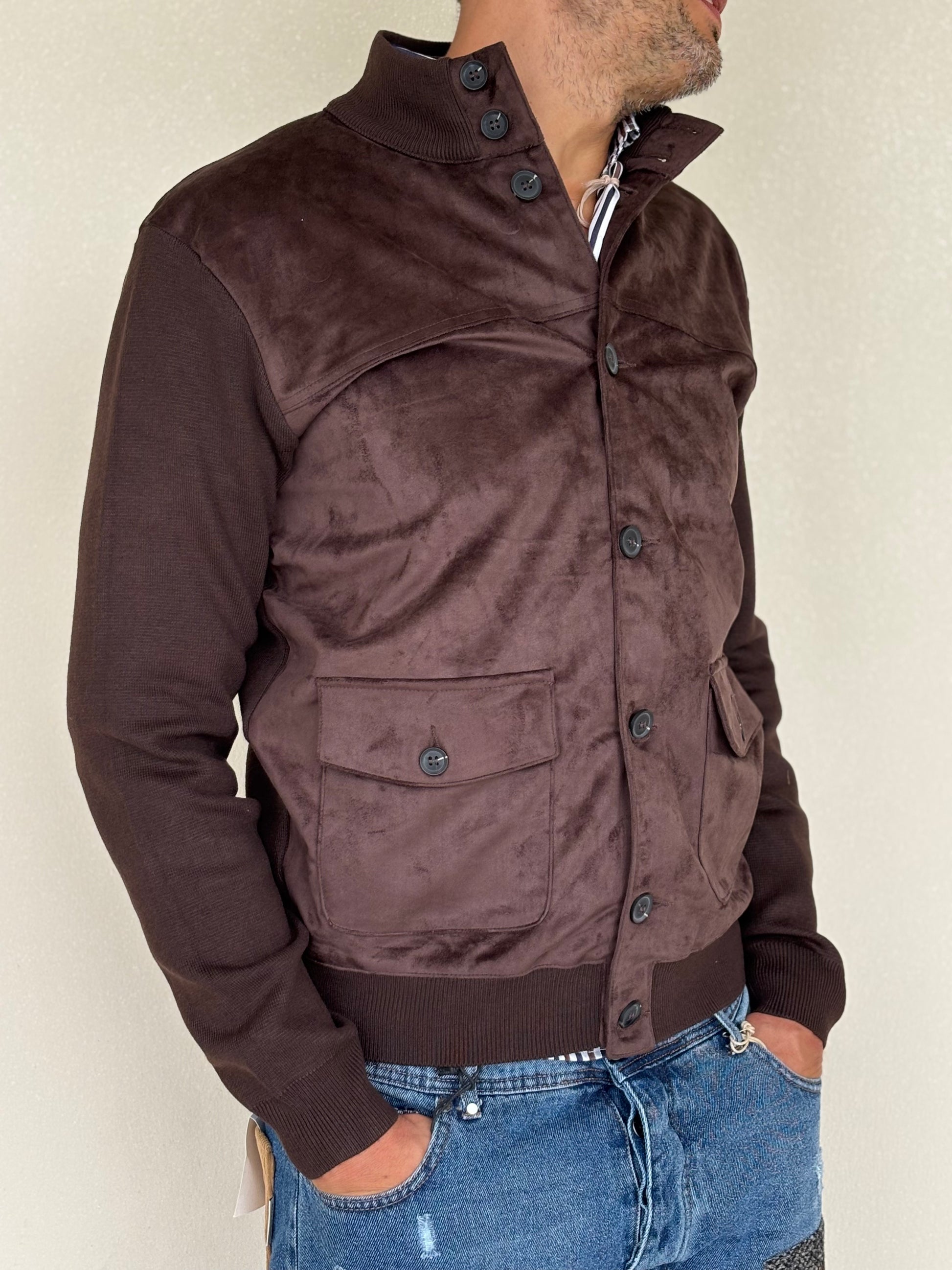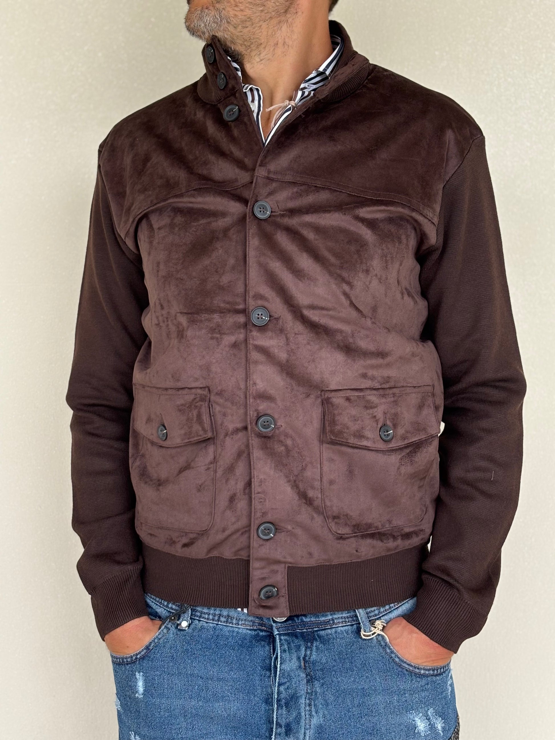 - Loft88 Giaccamaglia simil dainetto davanti con tasche toppa e in maglia dietro come le maniche, modello con mezzo collo, fodera interna blu solo nella parte davanti