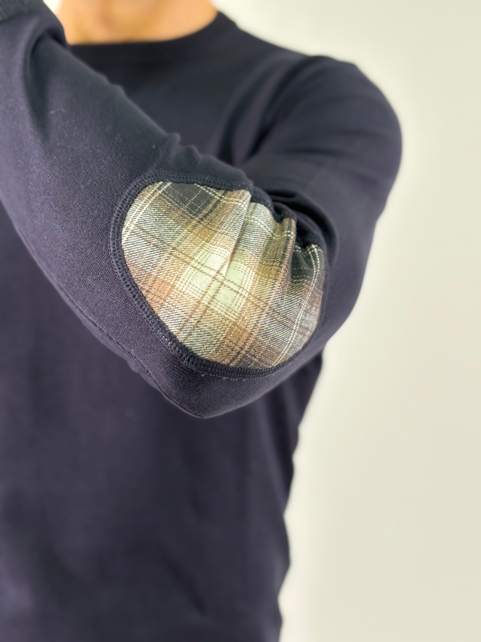 - Loft88 Maglia girocollo con taschino e toppe a scacchi sui toni del nero, panna e cammello, fondo e polsini a costine melange