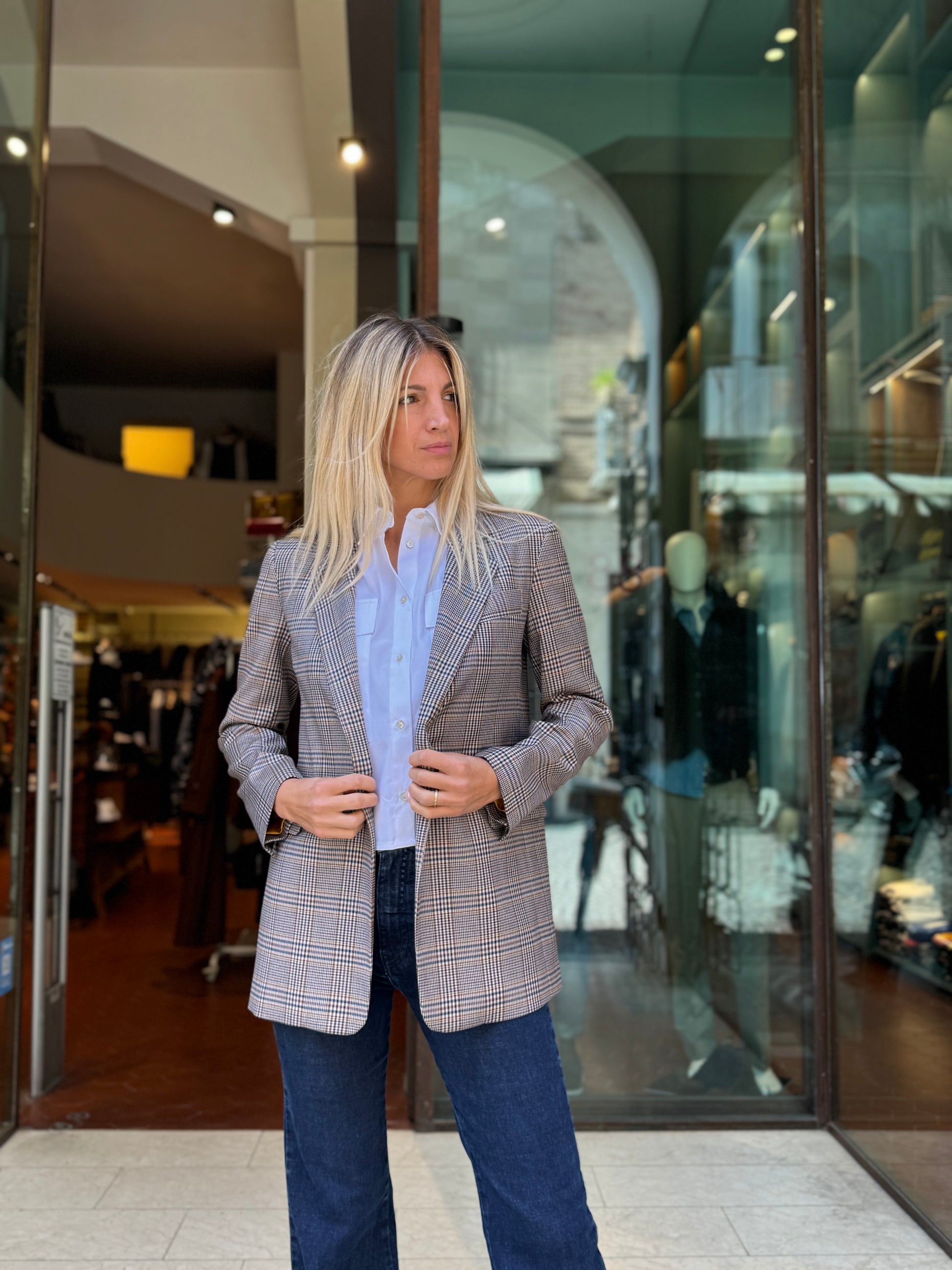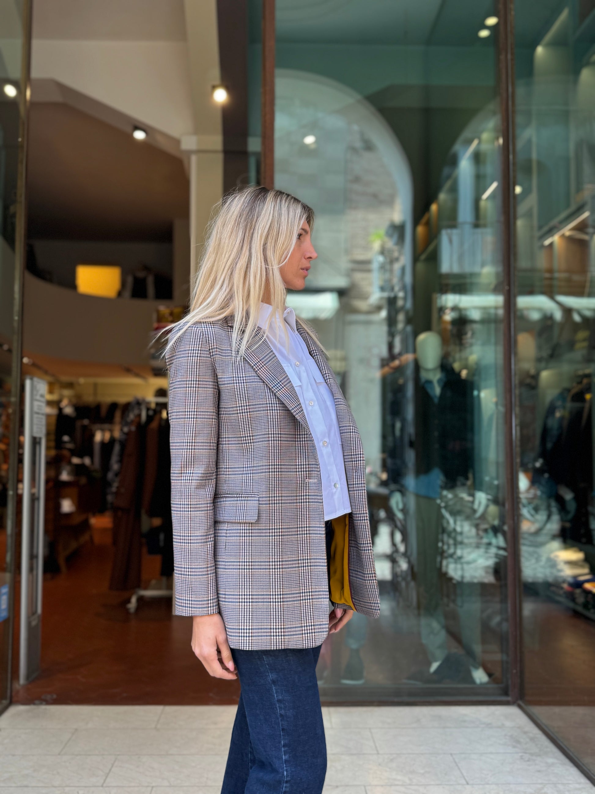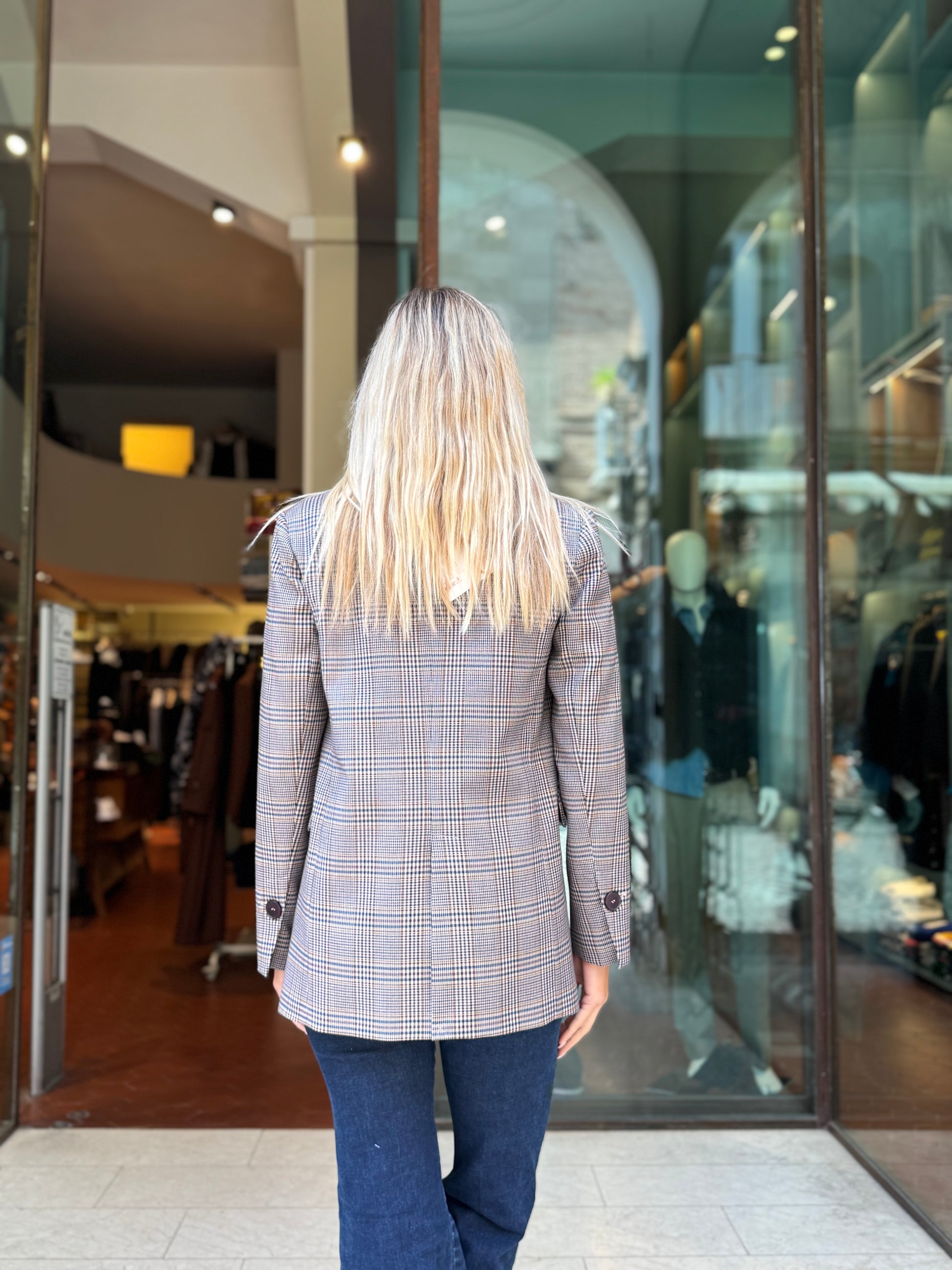 - Mercì Giacca lunga ad un bottone con spacchetto nel polso più bottone, tasche davanti con pattina e spacco centrale posteriore, fodera interna senape, fantasia a scacchi sui toni del panna, marrone, cammello, senape, celeste e bordeaux