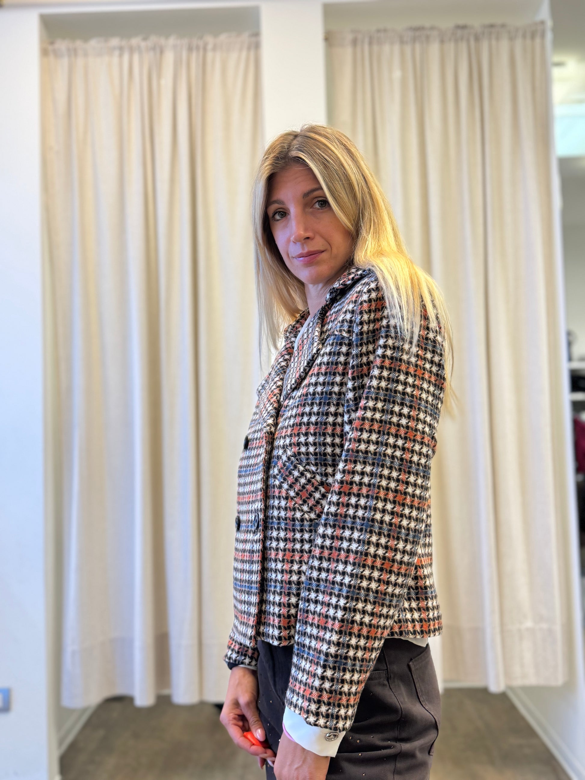- Molly Bracken Cappotto corto doppiopetto a scacchi sui toni dell' arancio, avio, panna, nero e cammello con tasche e fodera interna nera
