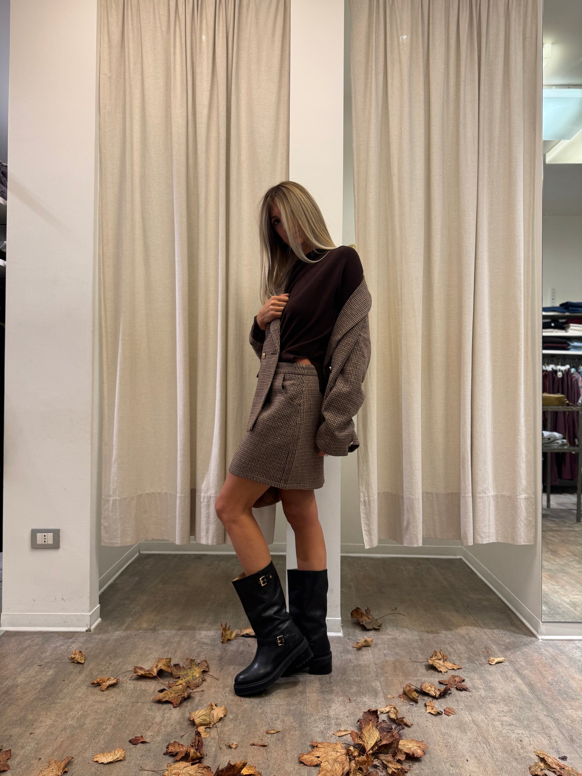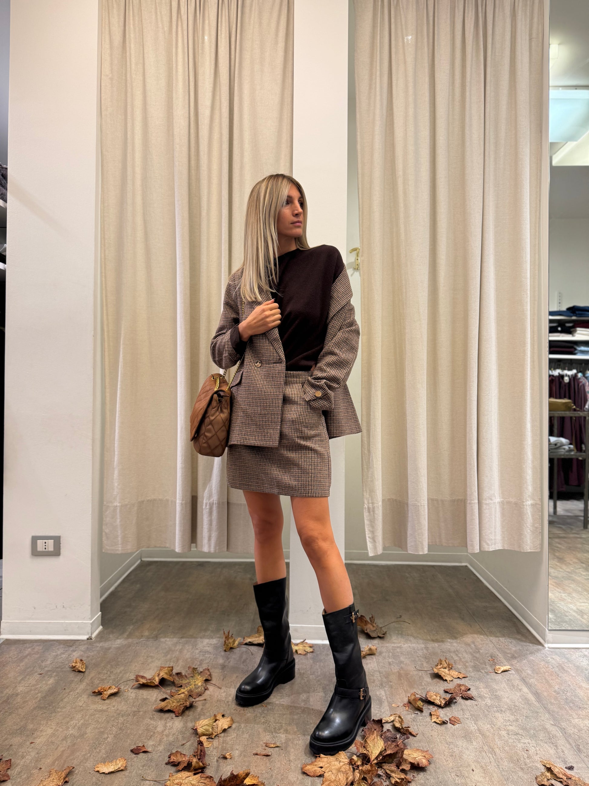 - Molly Bracken Giacca doppiopetto con tasche toppa, polso con spacchetto e bottone oro, tessuto pied de poule sui toni del beige, coccio e marrone, fodera interna marrone