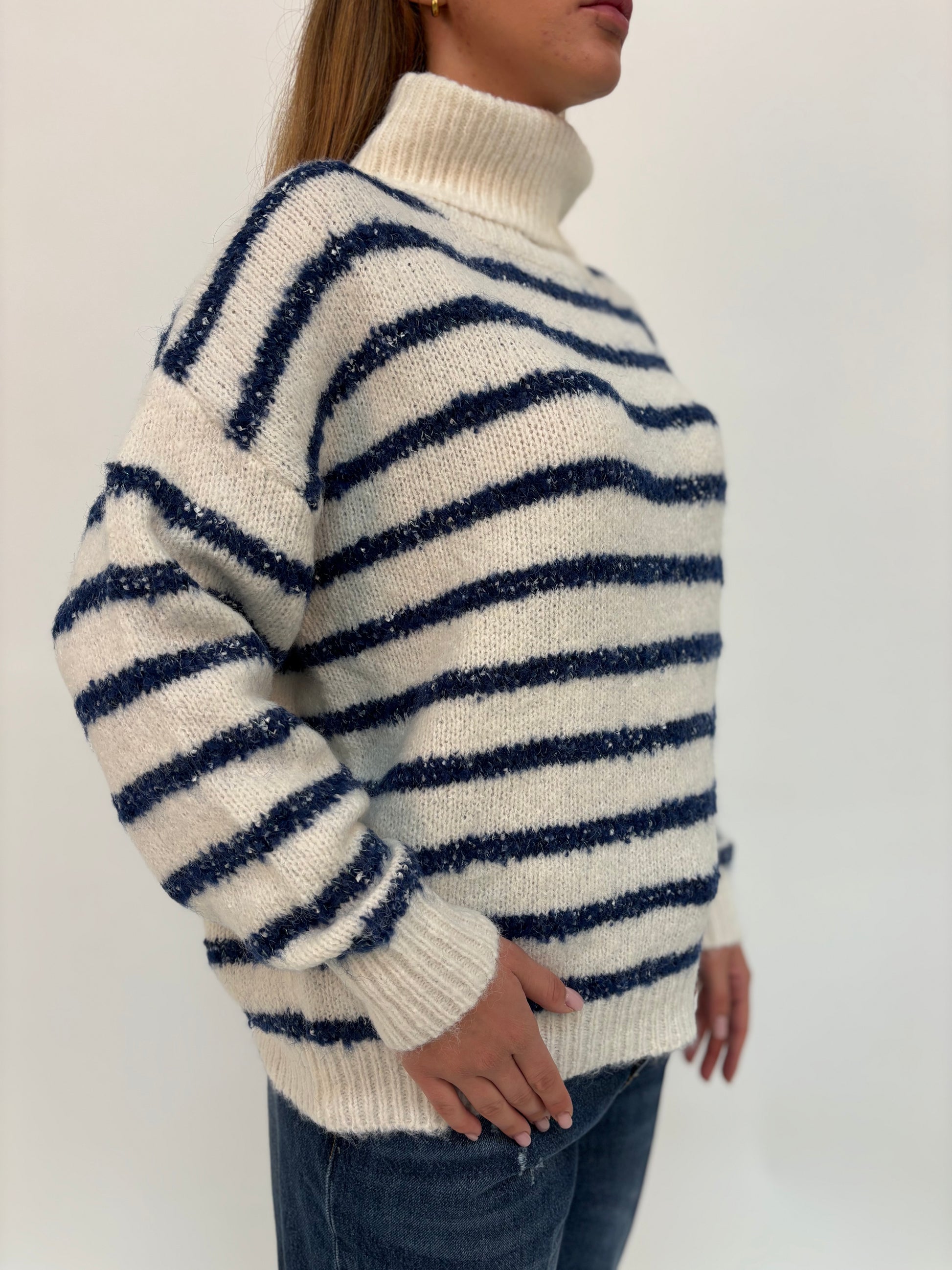 - Molly Bracken Maglia collo alto righe orizzontali blu melangiate e leggermente laminate, modello over a manica lunga