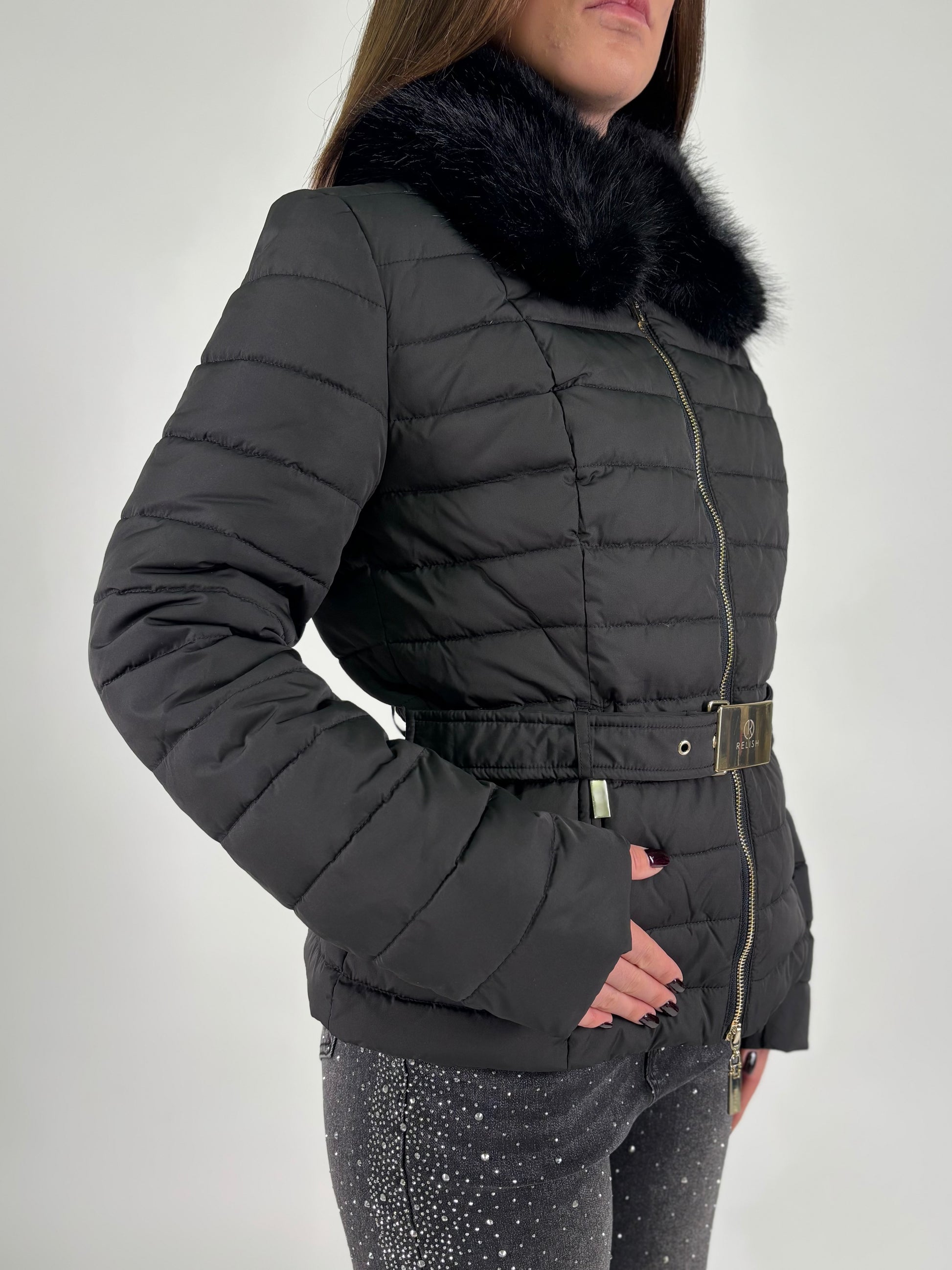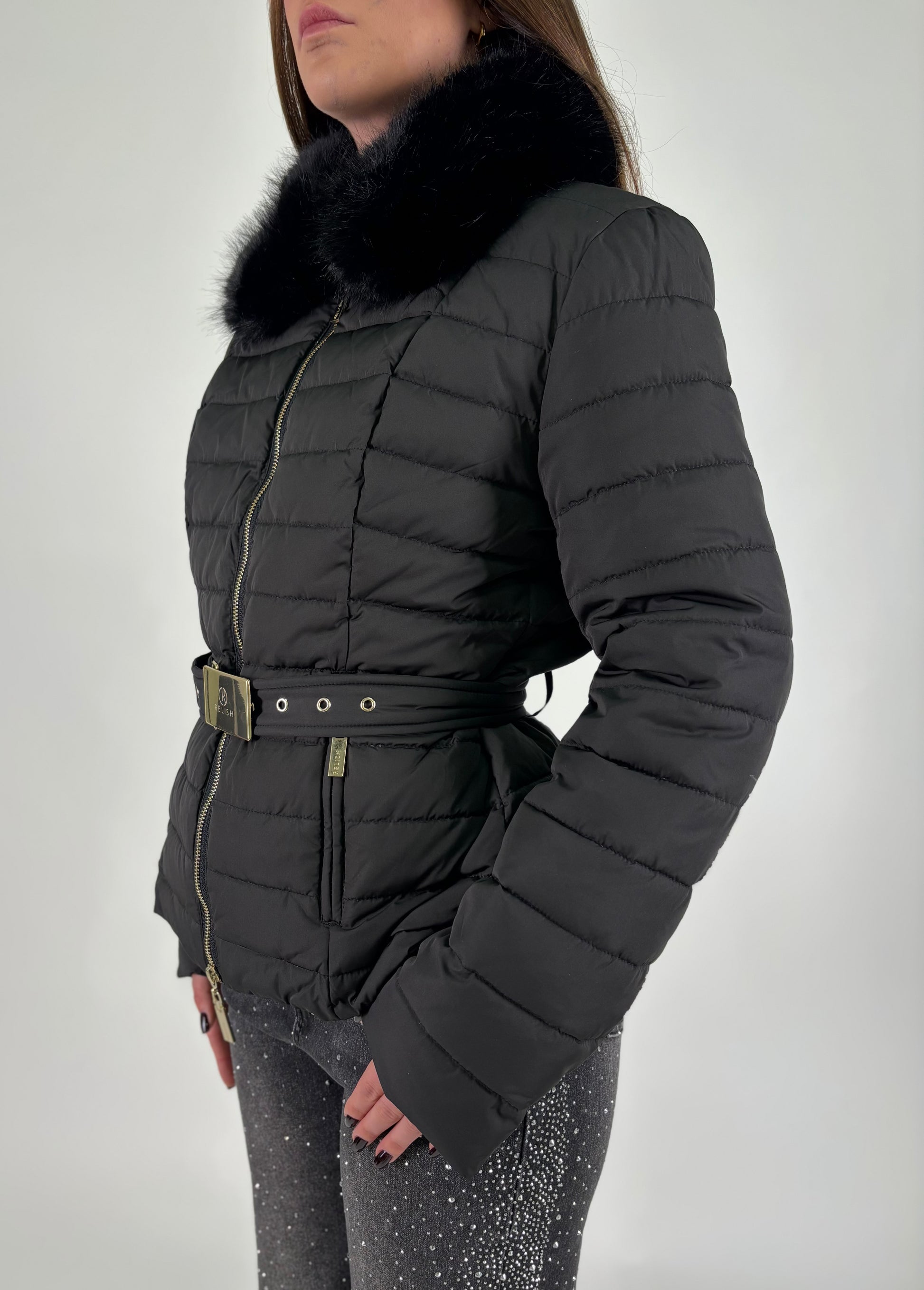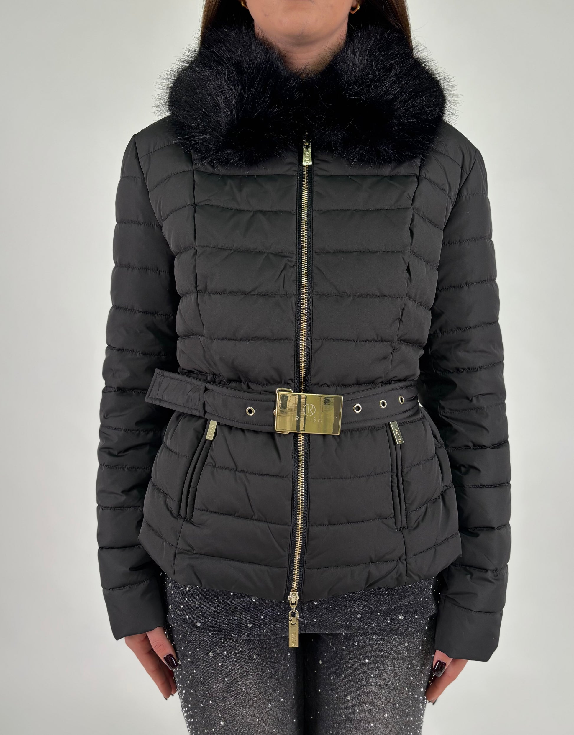 - Relish Piumino corto con colletto in ecopelliccia, allacciatura tasche con zip oro e piumino con zip oro a doppio cursore, cinta in vita dalla fibbia oro logata, fodera interna nera