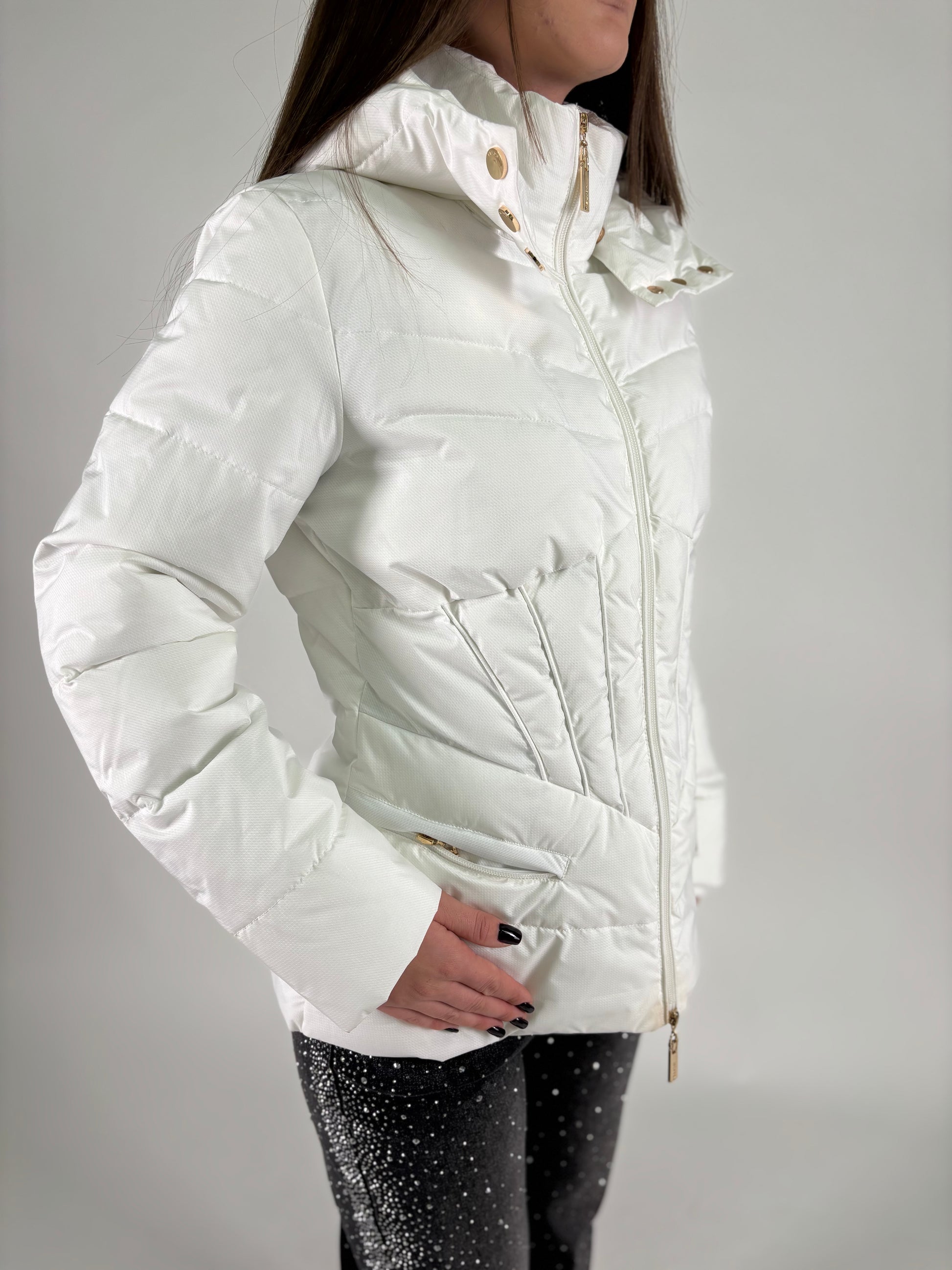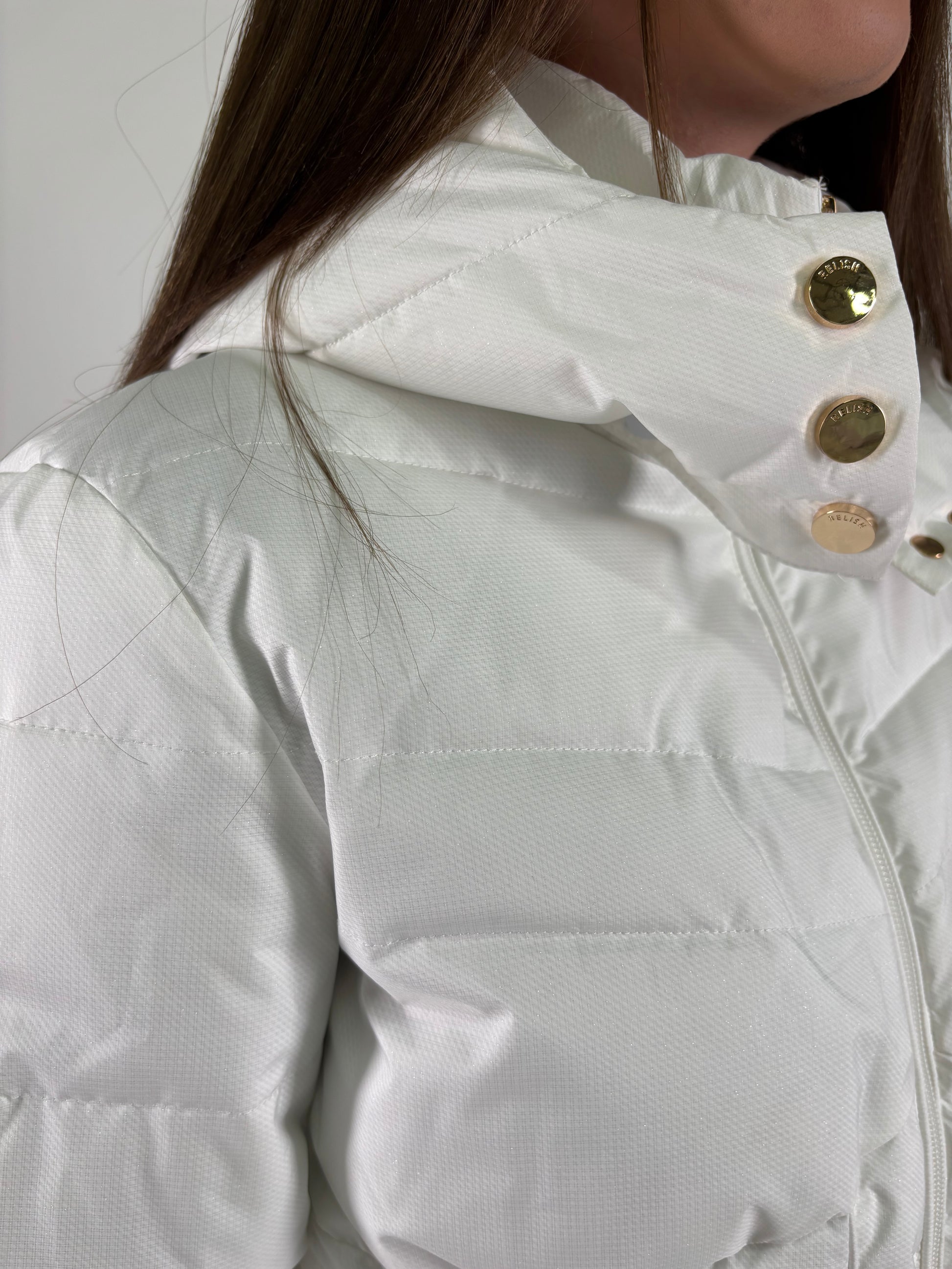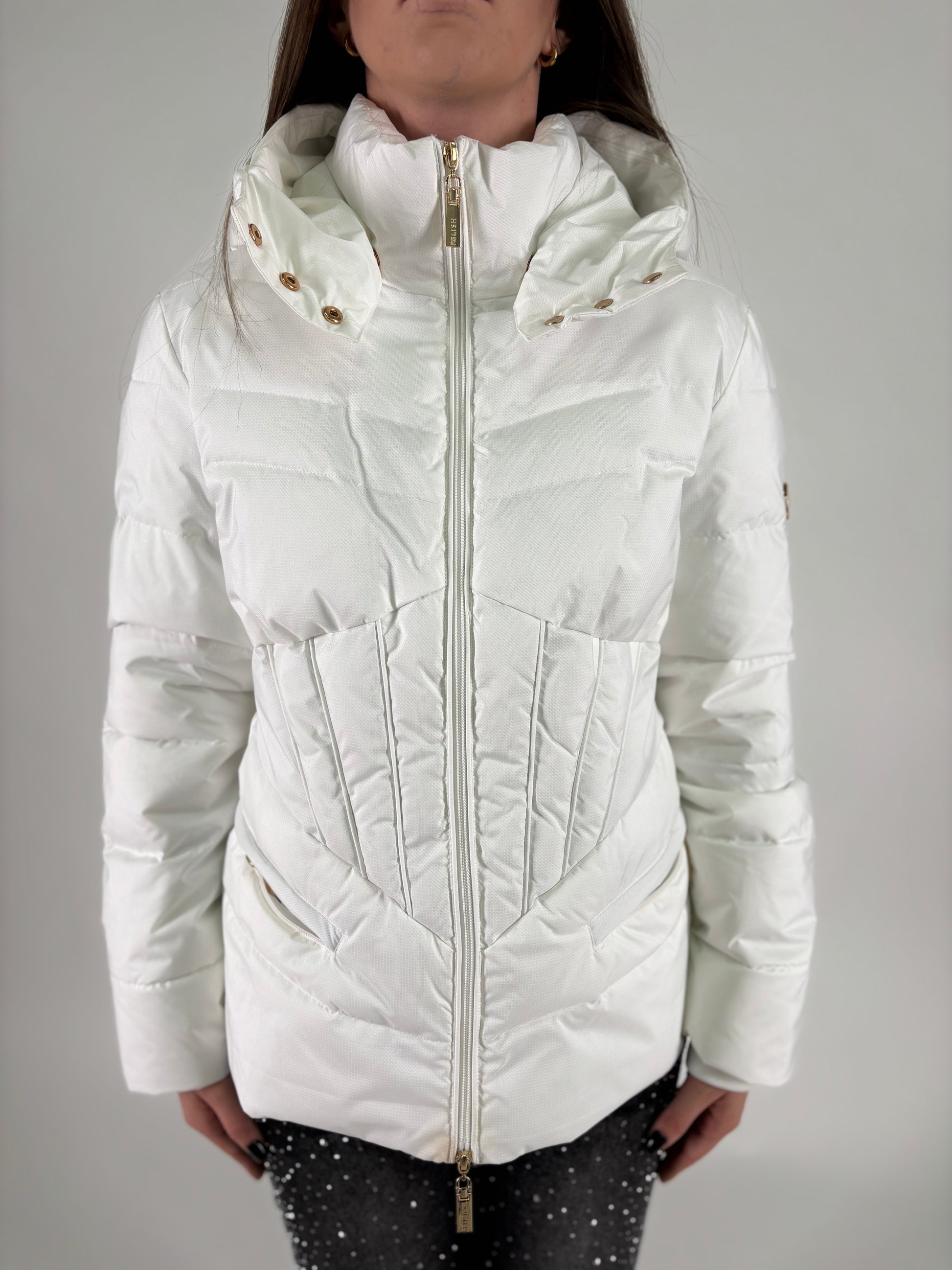 - Relish Piumino glitterato con cappuccio removibile, provvisto di tasche chiudibili tramite zip dall' accessorio oro e allacciatura con zip bianca dall' accessorio oro, polsino costine, modello schiantato.