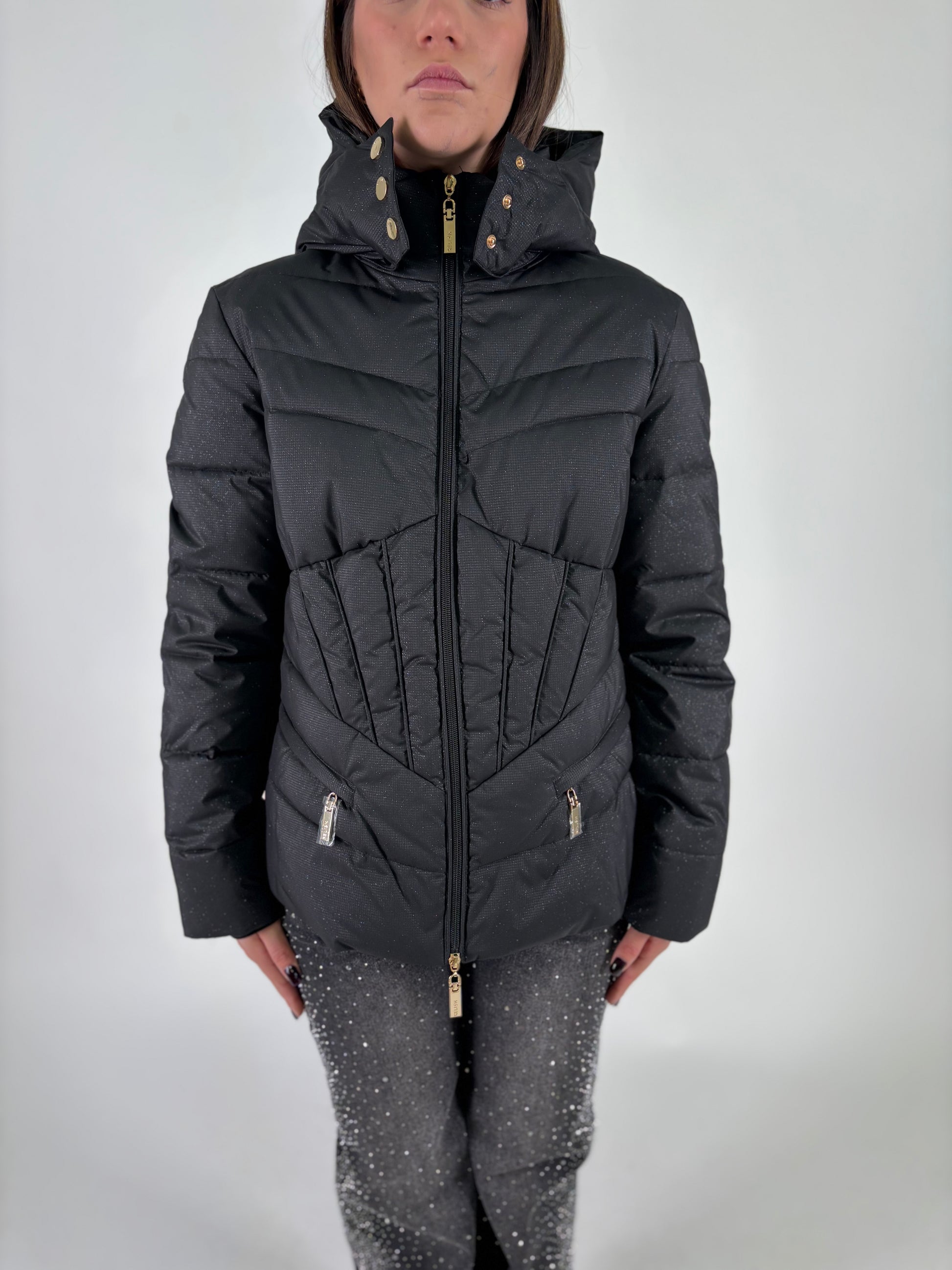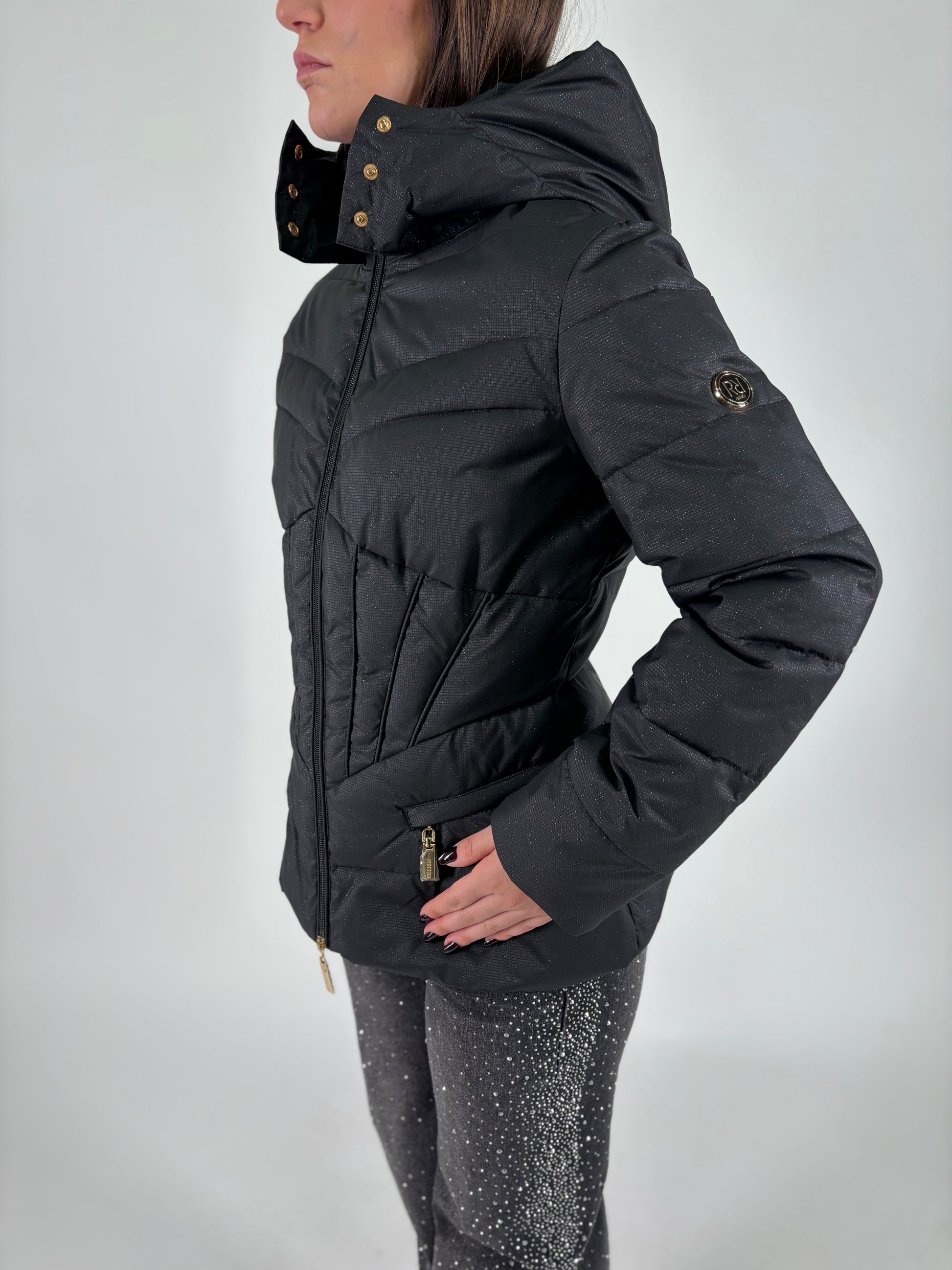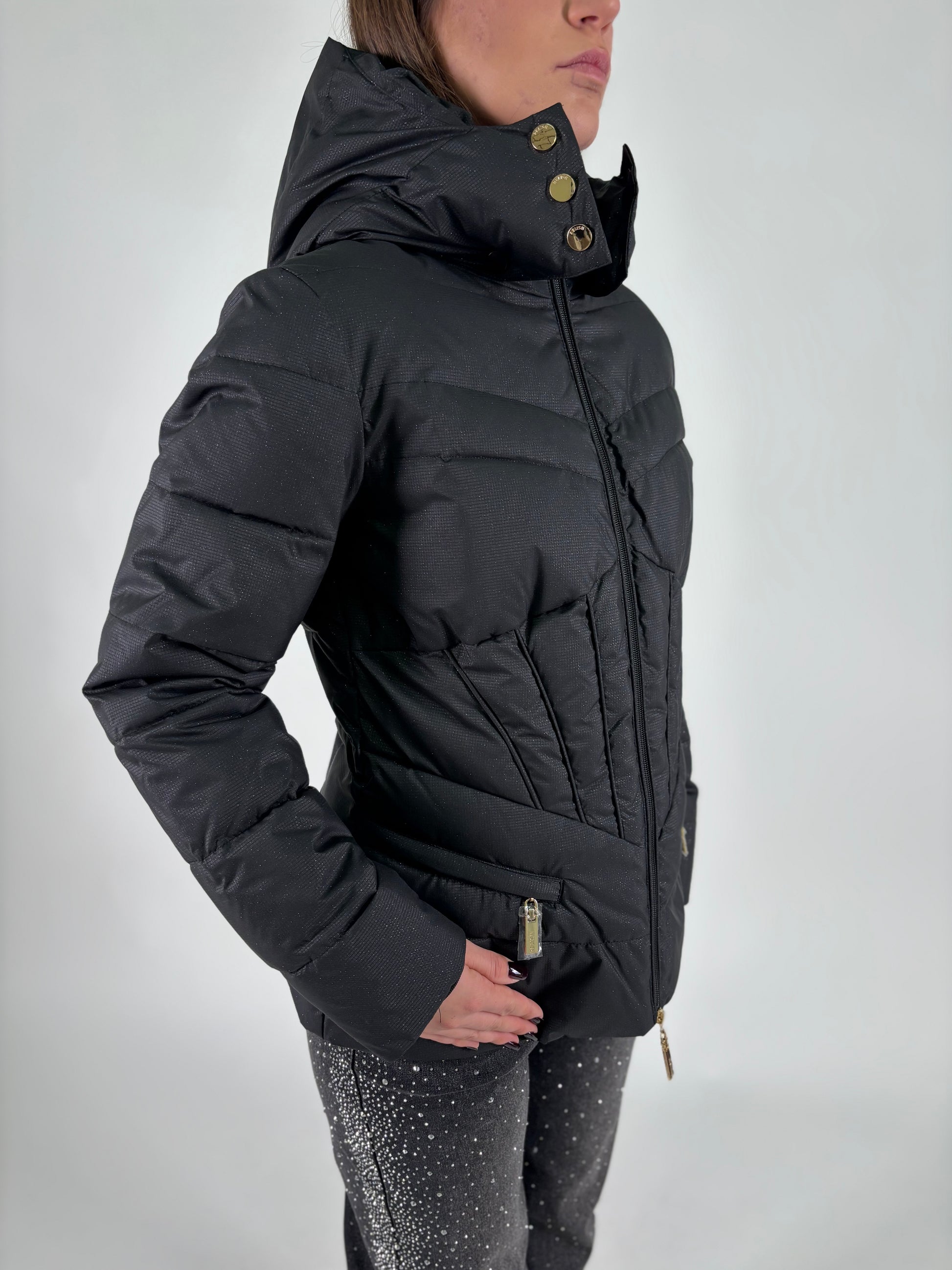 - Relish Piumino glitterato con cappuccio removibile, provvisto di tasche chiudibili tramite zip dall' accessorio oro e allacciatura con zip nera dall' accessorio oro, polsino costine, modello schiantato.