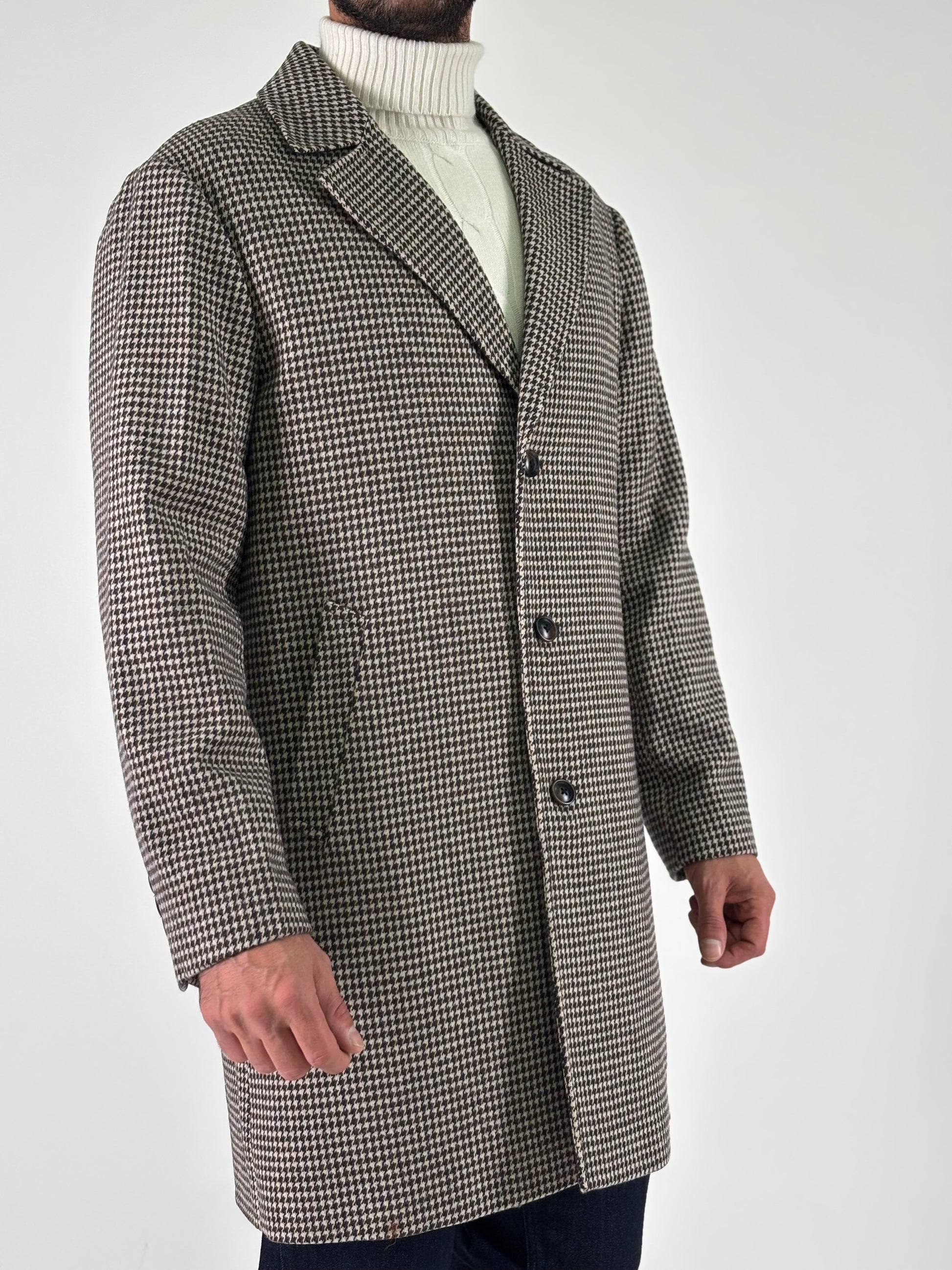 - Seinse Cappotto pied de poule con fodera interna bicolore, marrone nella parte inferiore e grigio in quella superiore, bottoni nel polso con spacchetto, spacco centrale posteriore, provvisto di tasche e taschine interne