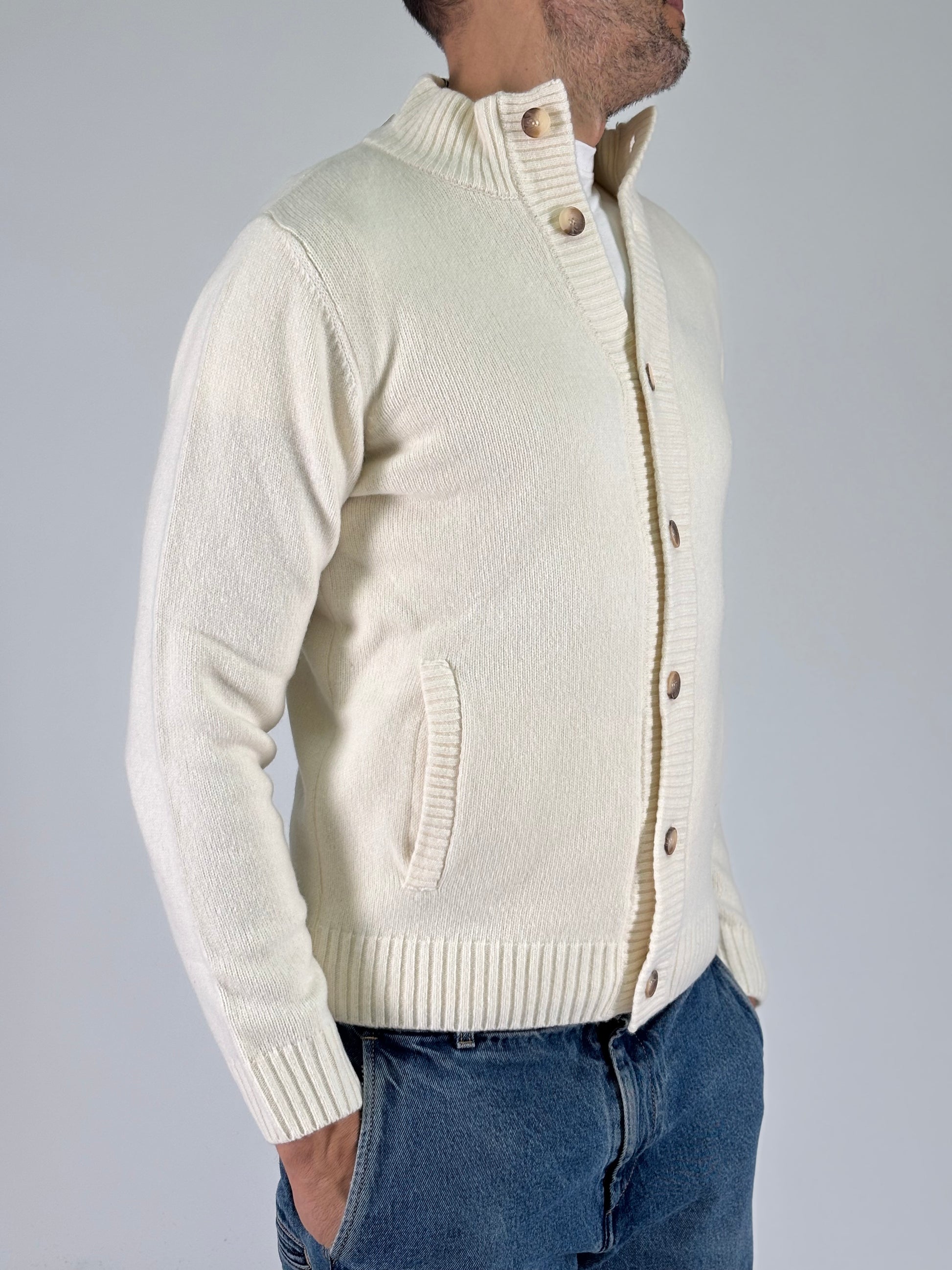 - Sporting Mare Cardigan con tasche e colletto realizzata con filati italiani dell' azienda Lanerossi, collo, tasche polso e fondo a coste