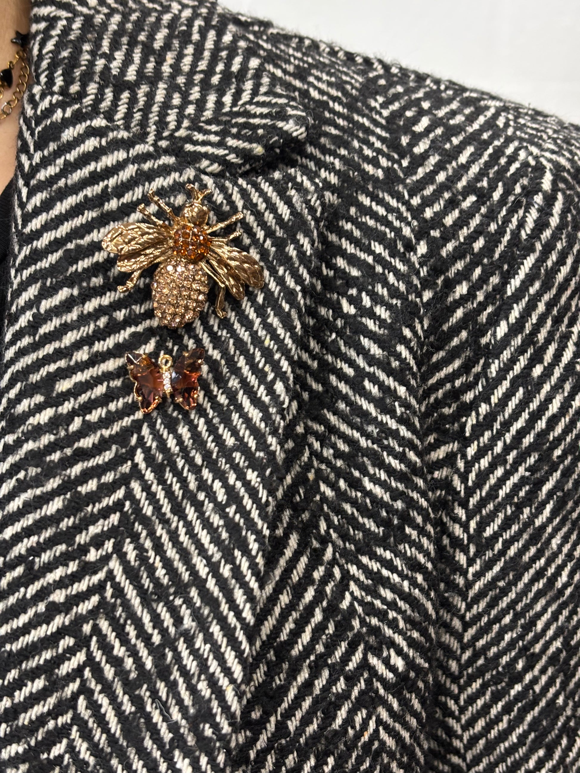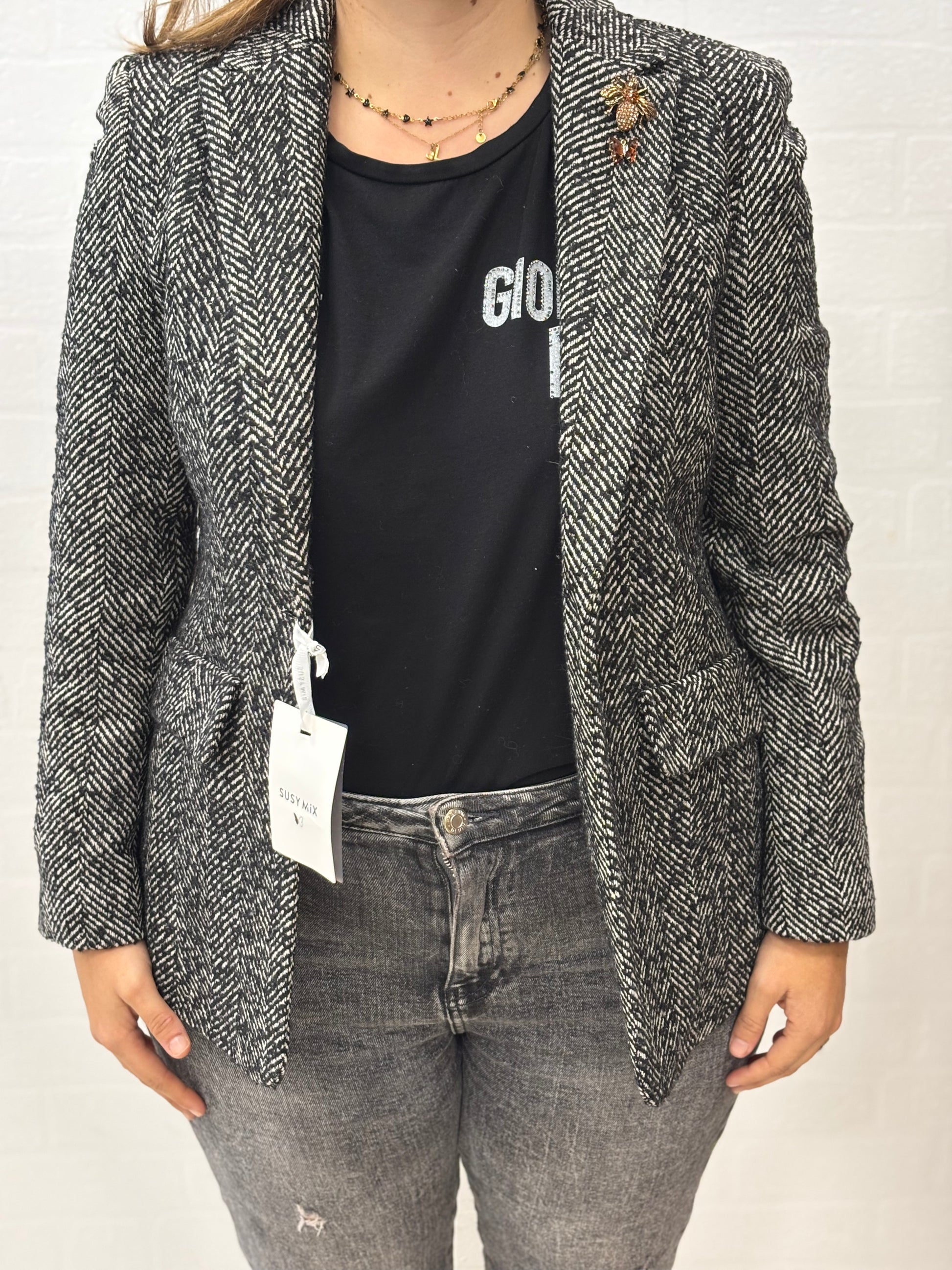 - Susy Mix Giacca spinata ad un bottone con tasche a pattina, spille gioiello e fodera interna a fantasia