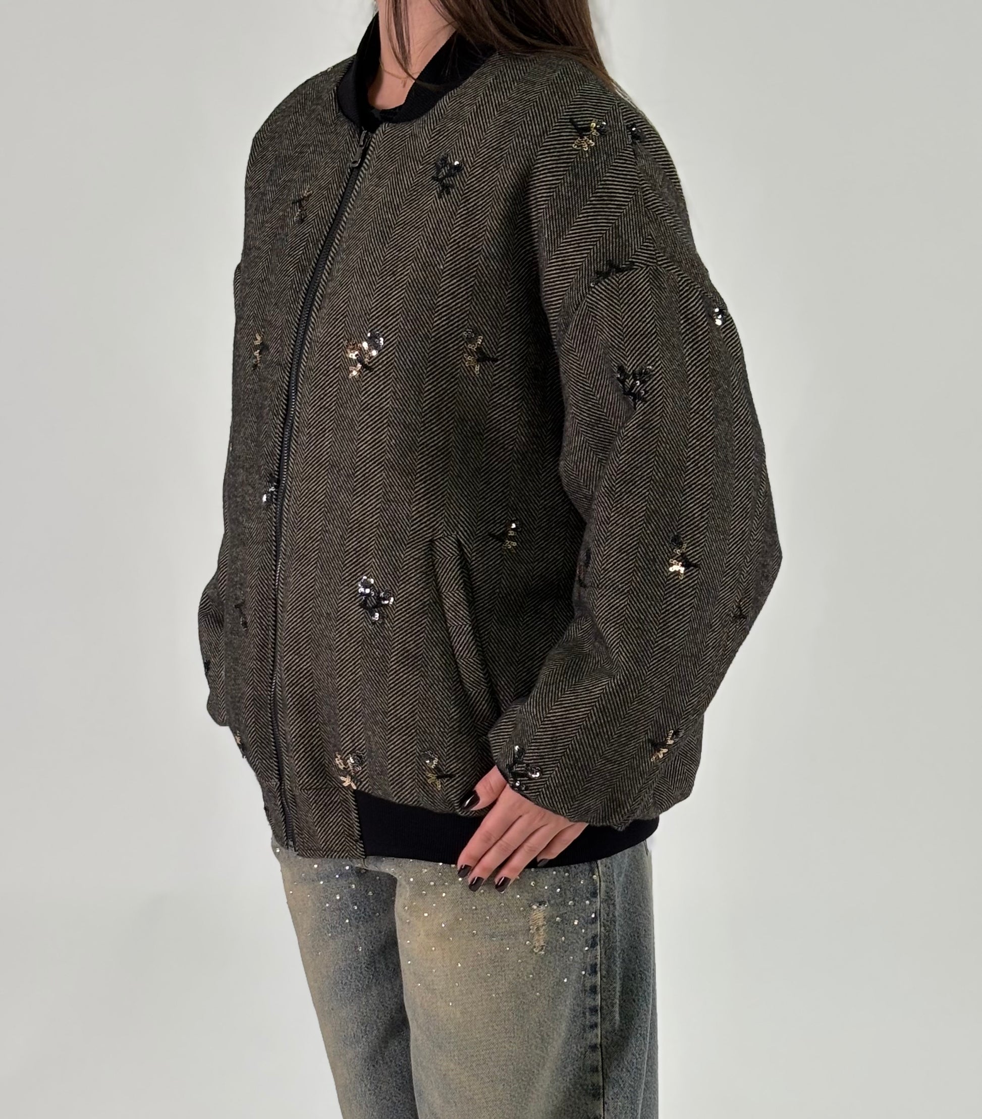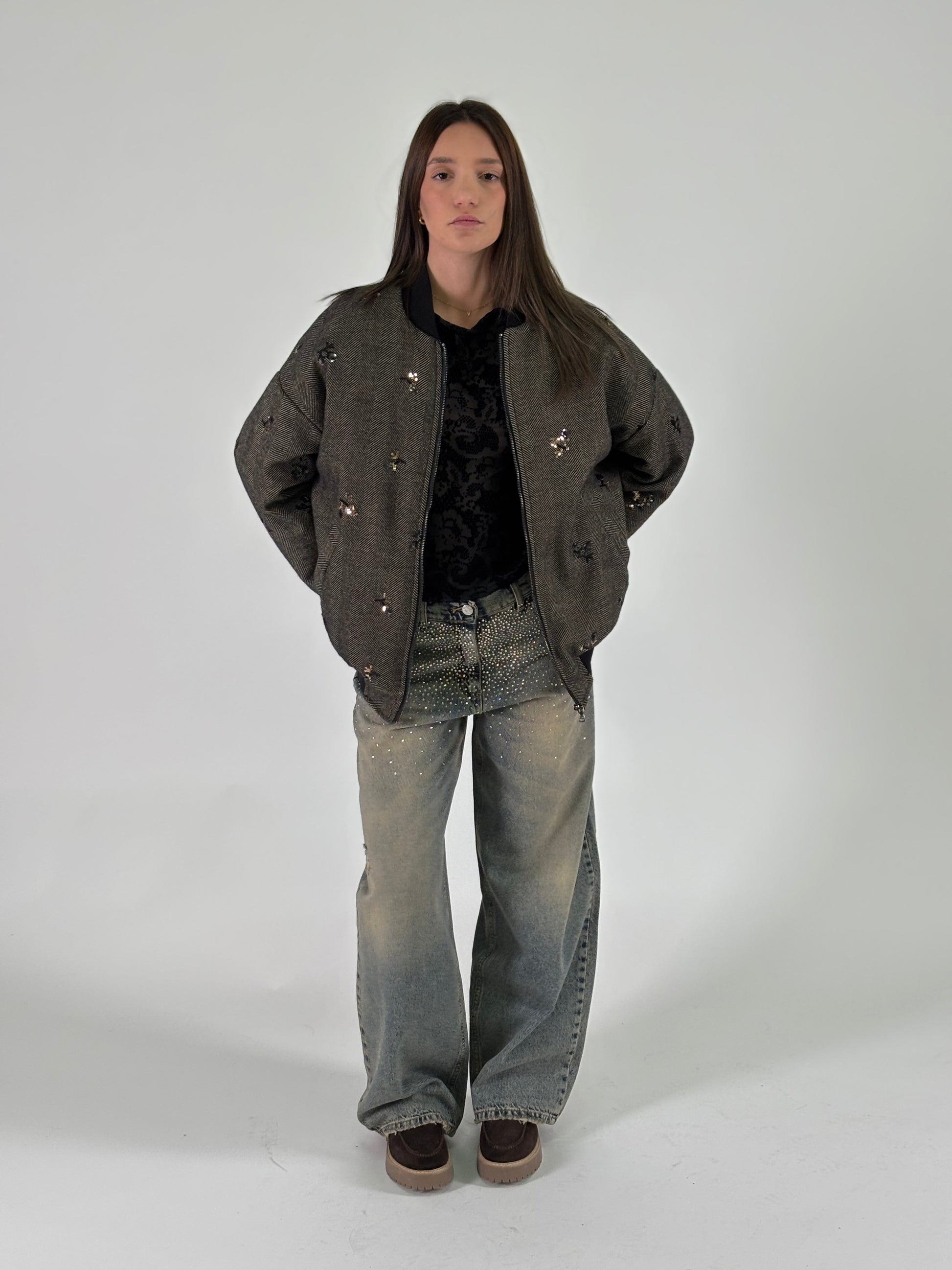 - Susy Mix Giubbino bomber spinato sul nero e beige con rigami di paillettes sugli stessi colori, modello trapuntato nero, provvisto di tasche e zip antracite, collo polsini e canolè in tessuto nero a costine, vestibilità comoda