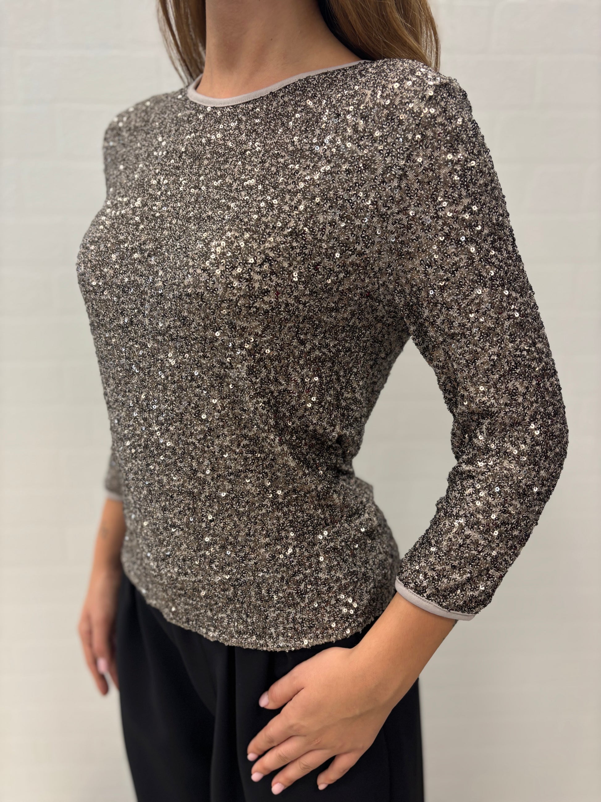 - Susy Mix Maglia in paillettes modello girocollo con manica 3/4, tessuto stretch