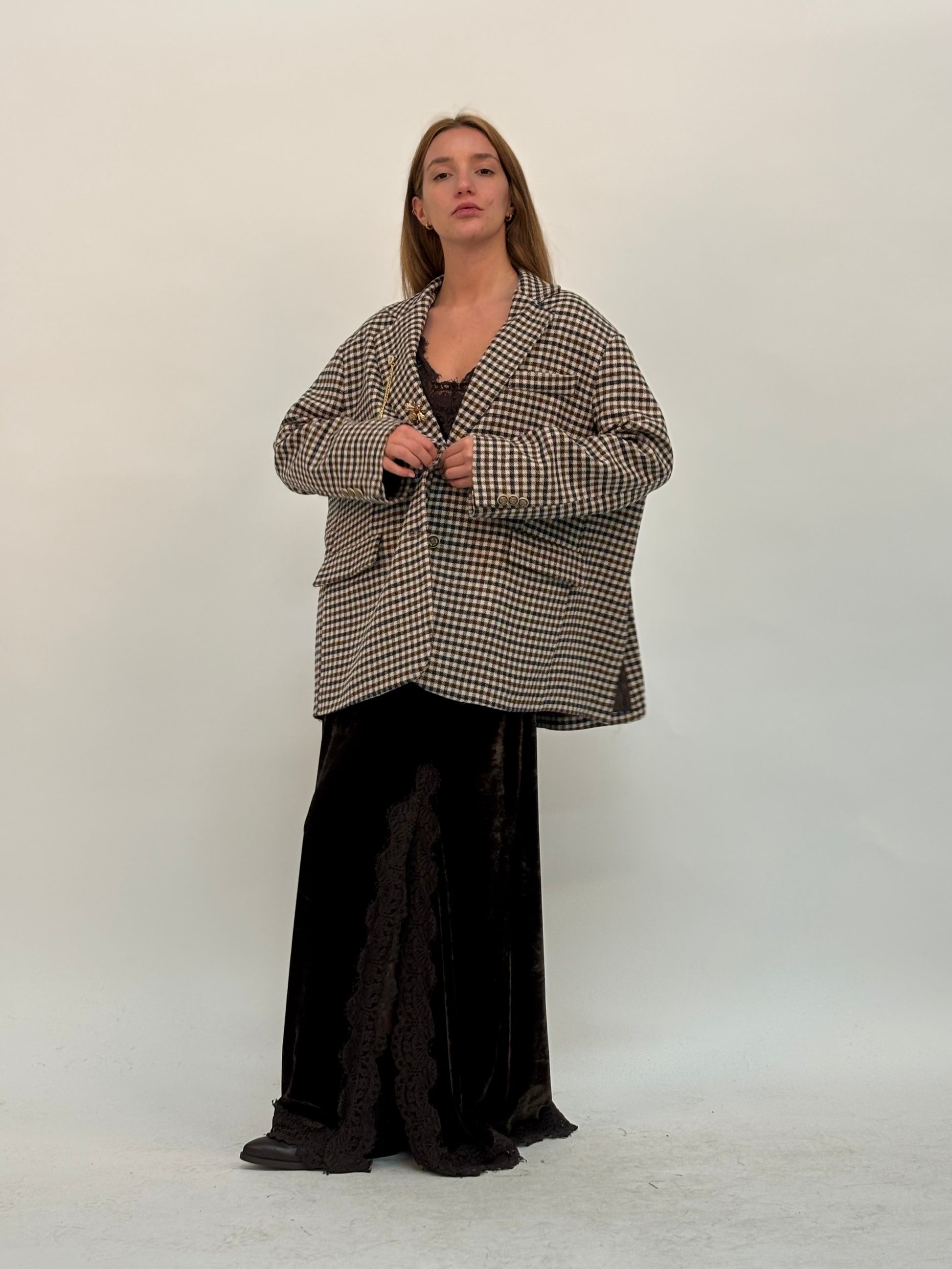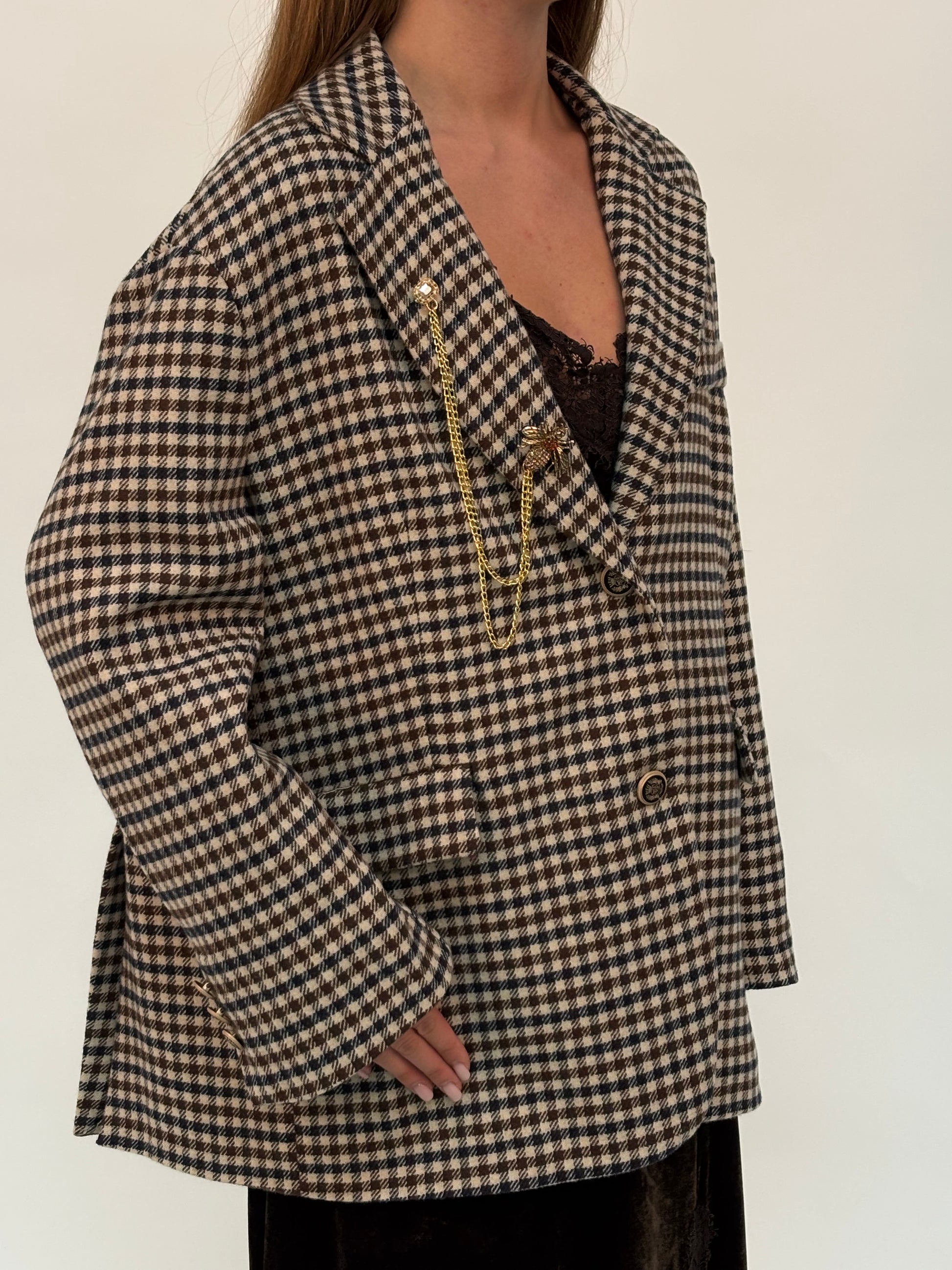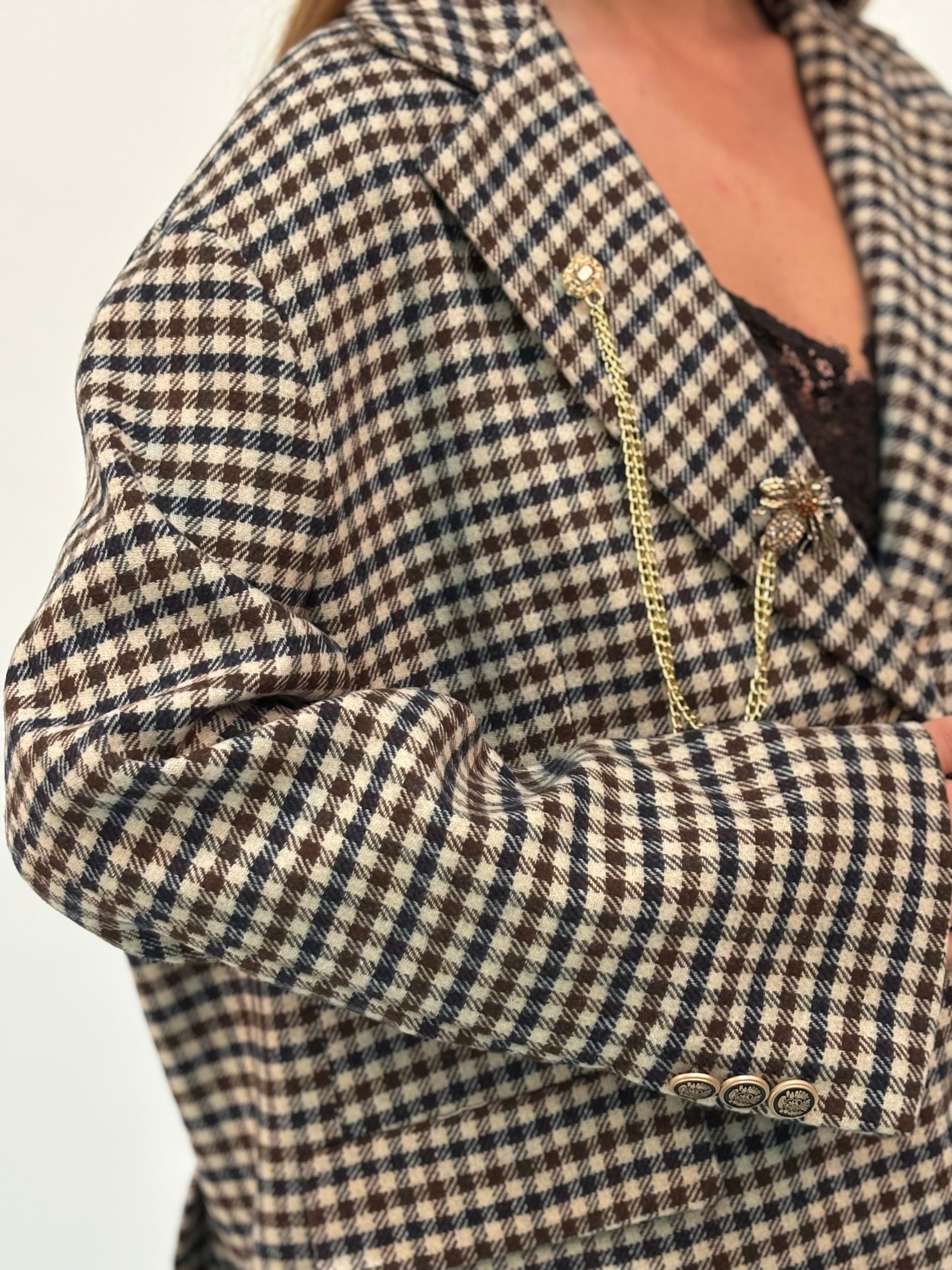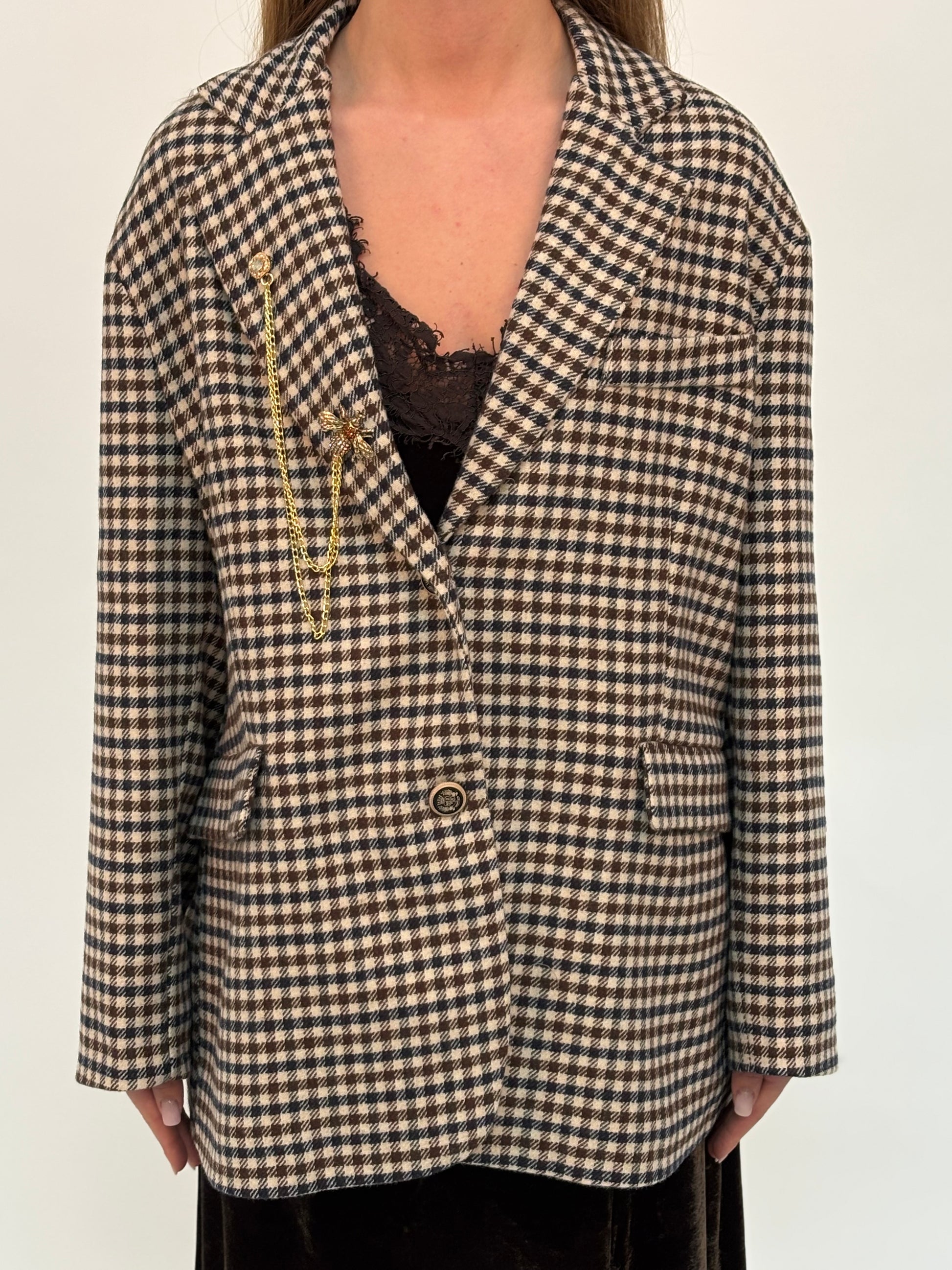 - Tensione In Giacca corta over a scacchi a due bottoni operati, fodera interna marrone, taschino e tasche a pattina, spacchetti posteriori e spilla gioiello oro removibile.
