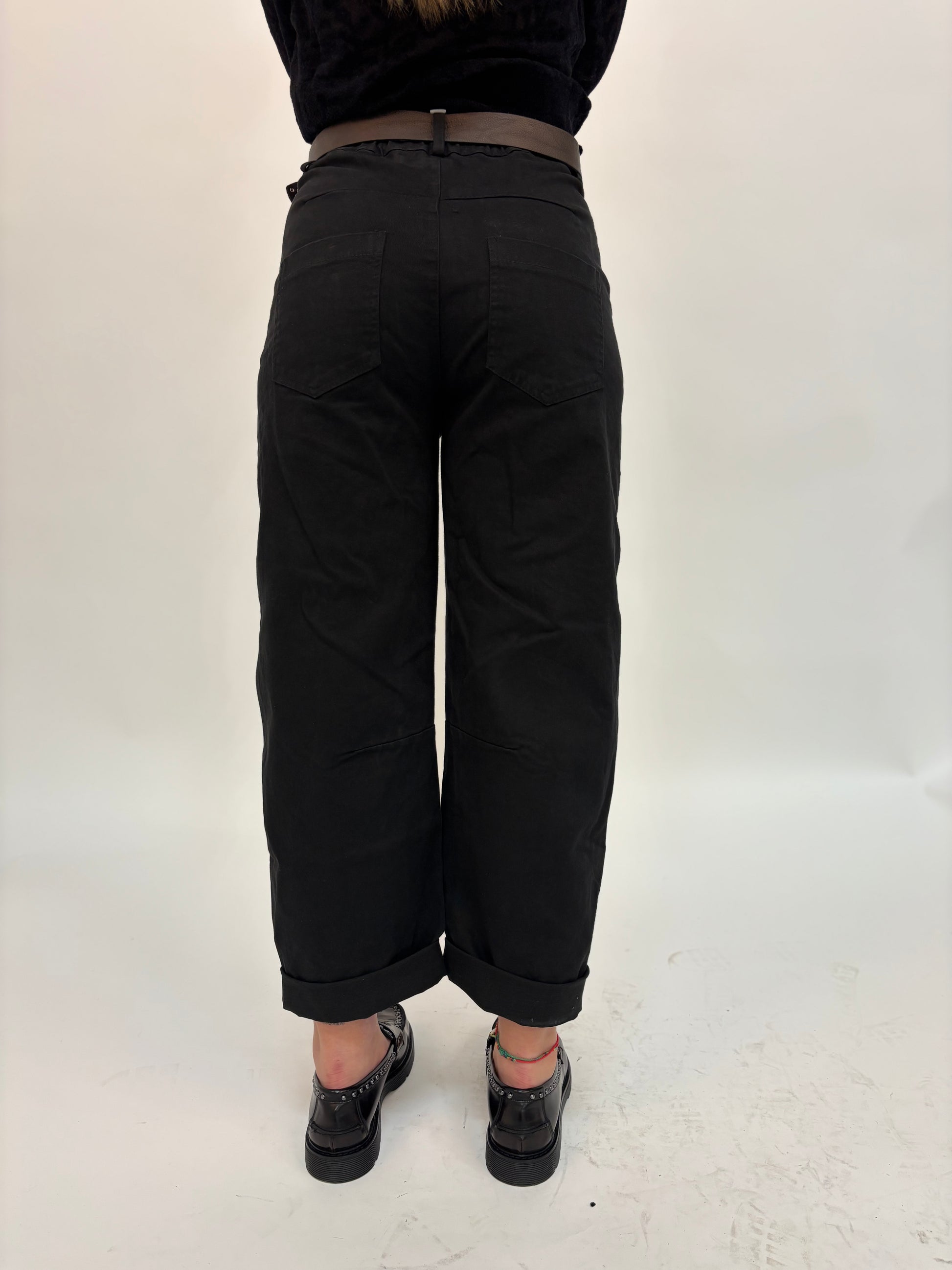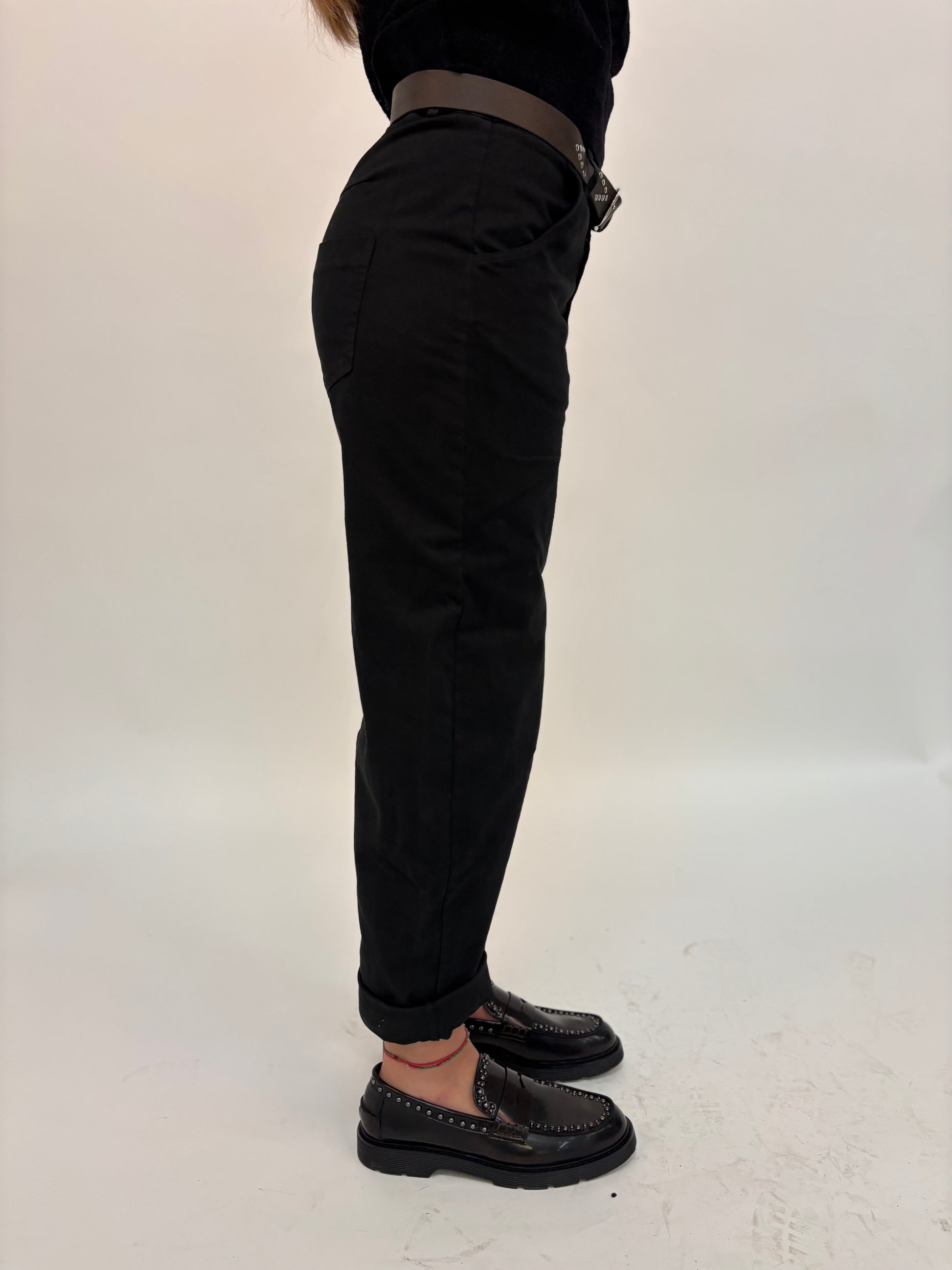 - Tensione In Pantalone ovetto con cintura in ecopelle con fibbia e borchie argento, pantalone con tasche e allacciatura ad un bottone più zip, elastico in vita nella parte posteriore e cucitura nella parte interna del ginocchio