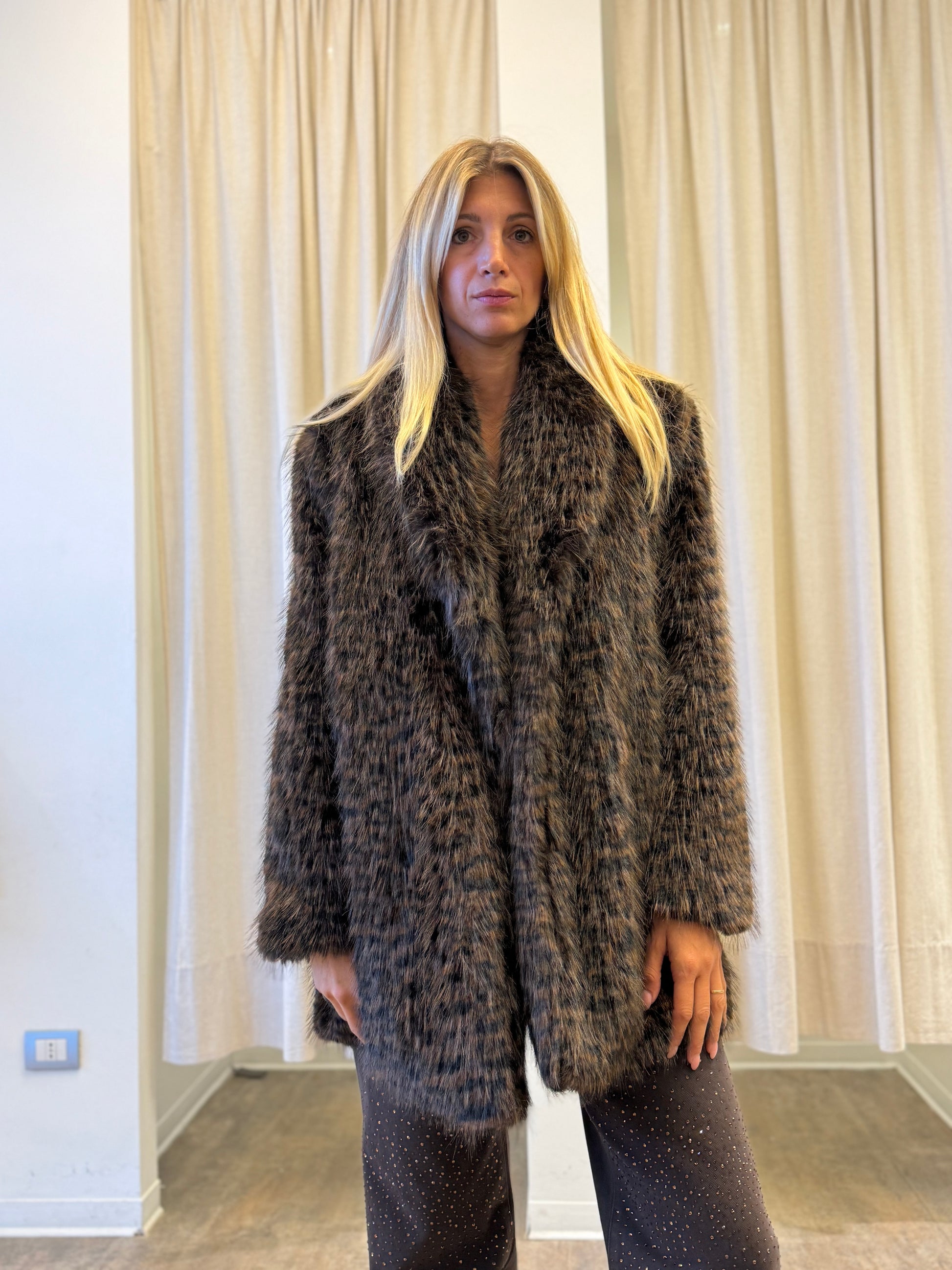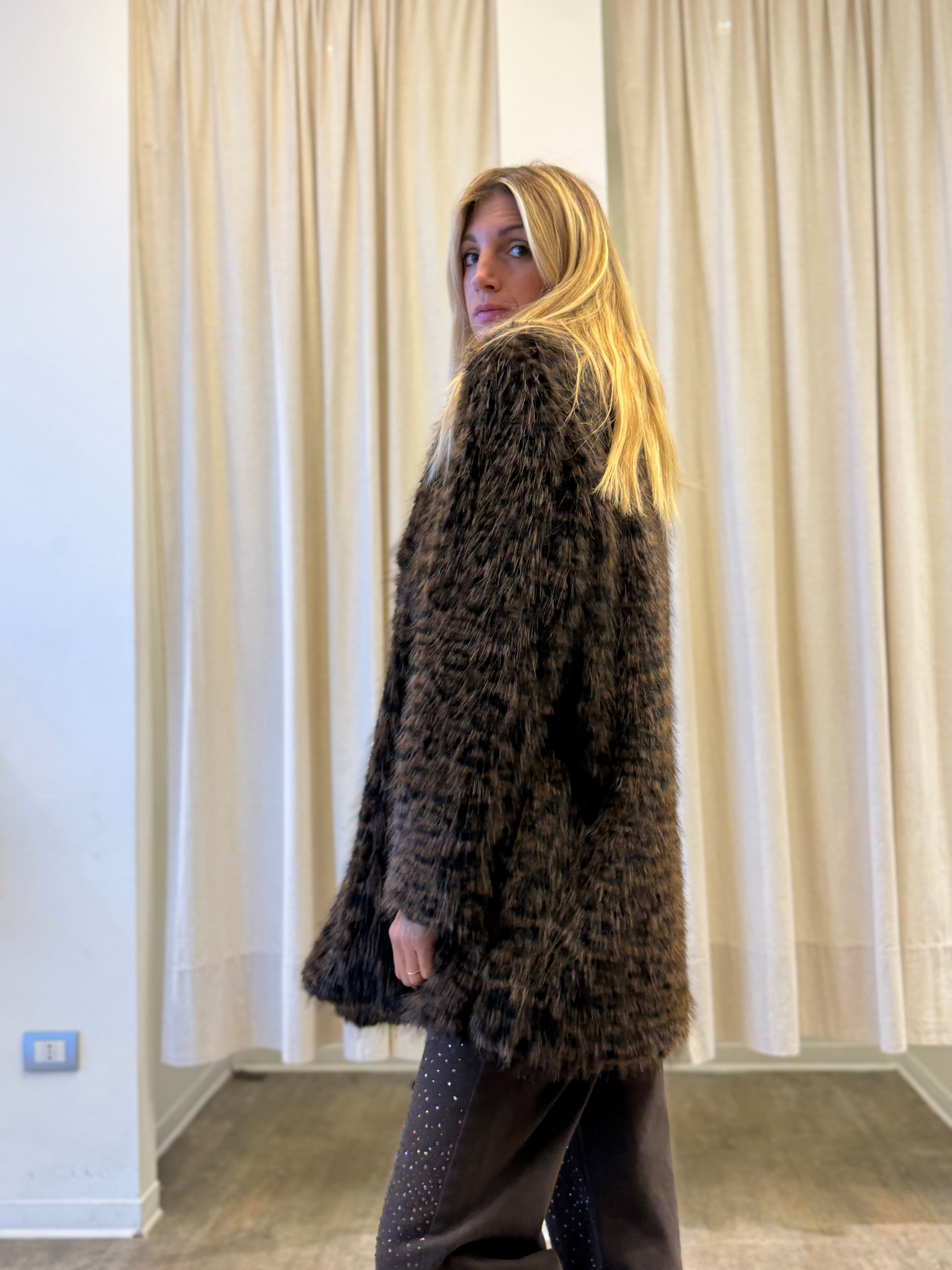 - Tensione In Pelliccia lunga sintetica, dotata di cintura per allacciatura in simil pelle color cuoio come la fibbia, fodera interna marrone chiaro